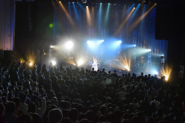ミュージカルのような展開をみせる「ソルフェージュ」、要所に差し込まれるウィスパーボイスにドキドキさせられる「太陽を巡って」、雰囲気がぱあっと明るくなり会場の温度が上がった「secretmelody」のあと、ついにその時が訪れる。MUSIC FORMUSICのNaoki ItaiとMEGの手によってライブ用として機動力高めにアレンジされ、三宅“バスター”亨(Gt.)のギターも激しく響く「囁きは“Crescendo”」で、牧野由依が踊ったのだ。その衝撃は、これまでいつもの着席スタイルでライブを見守っていた観客が、牧野から「みんな、立ってもいいんだよ?」という声を掛けられるまで立ち上がらなかったほど。本人は「(曲の最初で立ってくれなくて)一瞬心が折れたんだよね」と自嘲気味に笑っていたが、客席から観ていた身として、これは決してネガティブな反応ではなかったのだとフォローしておきたい。
