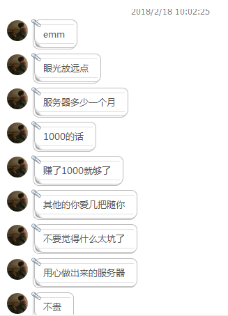 升级,我说不要太坑,他说这不坑,他良心做出来的服不算贵。我就很气,坑玩家,我最气愤就是这个,而且他说 比如你服务器1000元一个月 只要1000元 其他的都随你 说好建设服务器呢?我觉得这服顶多是个几十,然后就坑玩家!!!我觉得这意思是,我就开最低等级的服,能赚钱付够一个月就行,不升级!!!后来我去群里给赞助第一的人说,他说他氪金了3000,我就跟他解释,因为我最看不惯的就是坑玩家,他最后删我了,我准备去群里曝光黑幕,最后不让我进群,还BAN我!