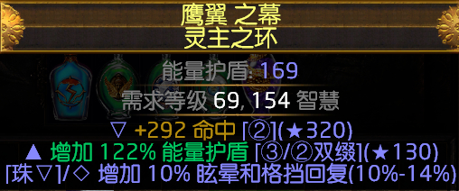 (39%能量护盾+17%眩晕格挡回复)这个算一个复合前缀,命中算后缀,43最大能量护盾算前缀,附魔64%最大能量护盾算前缀,多大师和智慧算后缀。