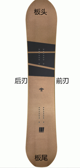 方向上为板头nose(滑行中的面朝的方向),下为板尾tail(滑行中背朝的方向),左前刃(脚尖的方向),右后刃(脚跟的方向)。