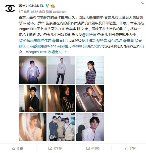 6/15 香奈儿品牌与电影界的合作由来已久,创始人嘉柏丽尔·香奈儿女士曾经为包括凯瑟琳·赫本、罗密·施奈德在内的很多女演员设计剧中及日常造型。昨晚,香奈儿与Vogue Film于上海共同举办“时尚与电影”之夜,展映了多支合作的影片,将这一传承不断延续。香奈儿中国彩妆形象大使