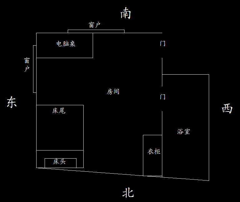 钱财容易意外需要支出。睡眠不好,精神差,男性缘比较差注意脚部位的意外受伤扭伤或者脚藓,电脑桌也比较少去实用,被门冲着。。。。整个房间偏角。床位也不对。床也被厕所冲到一部分。