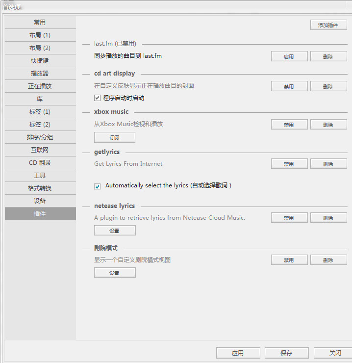 Ctrl+O首选项-插件-Netease Lyrics 启用