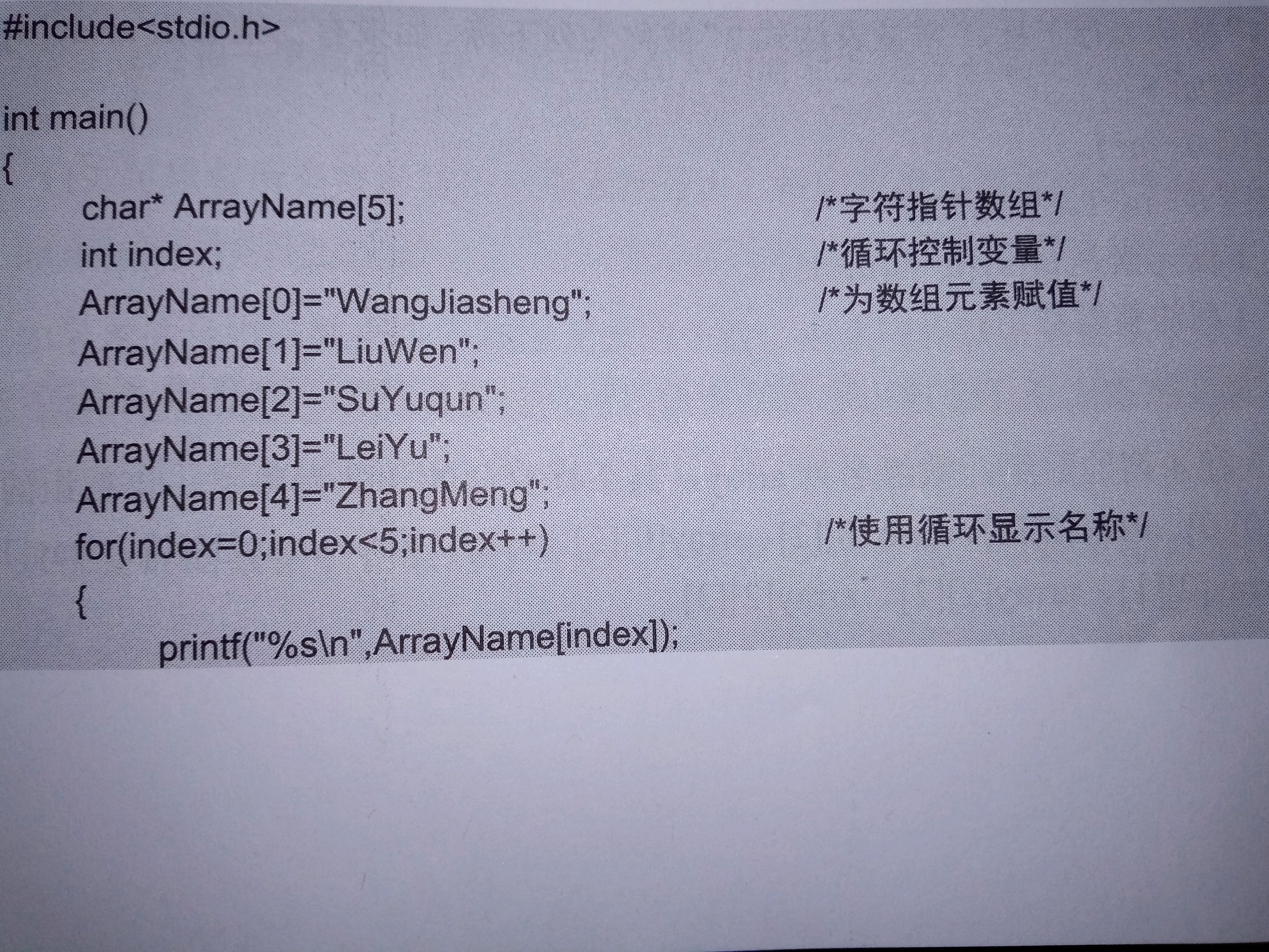 我在书上看到一个关于一维数组应用的实例,然后我想改变成能显示我输入的字符串,结果出问题了,再然后我又瞎改了一下居然成功了,我知道前一个程序为什么会不行。