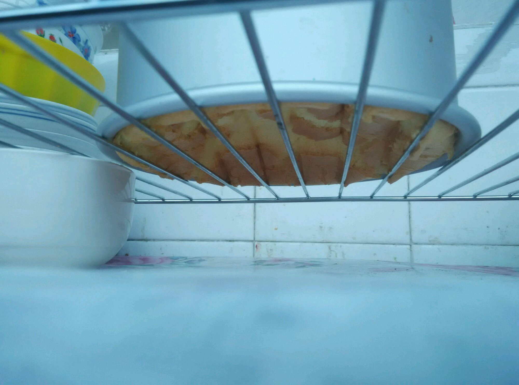 摔了,摔完立刻能看到热气出来,蛋糕体回缩。倒扣后它继续回缩。