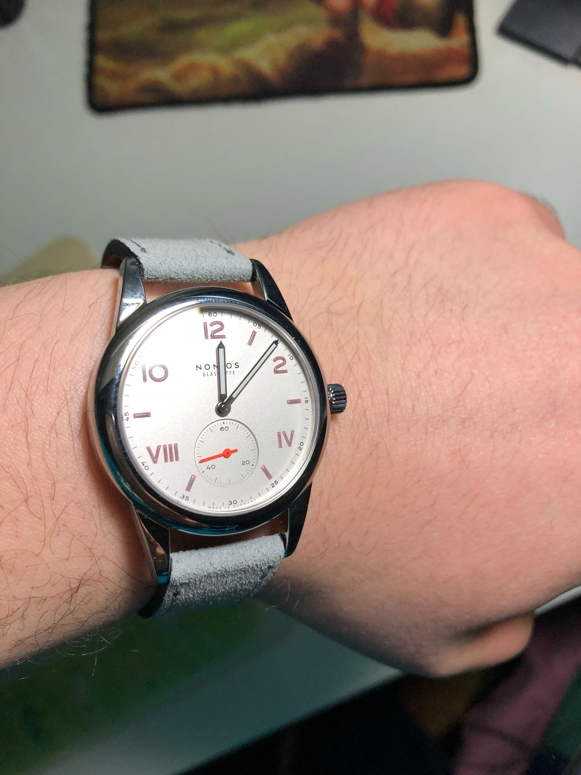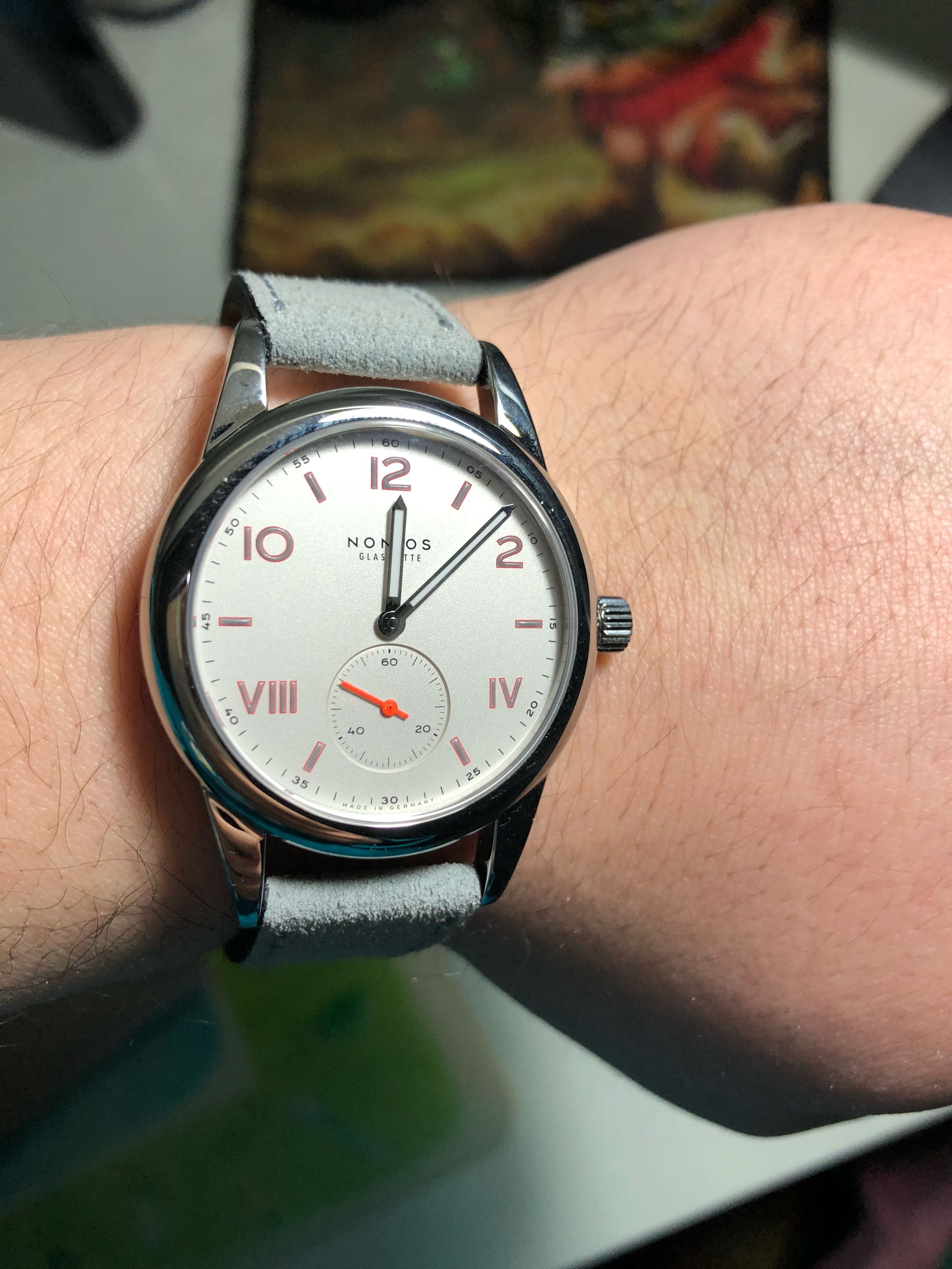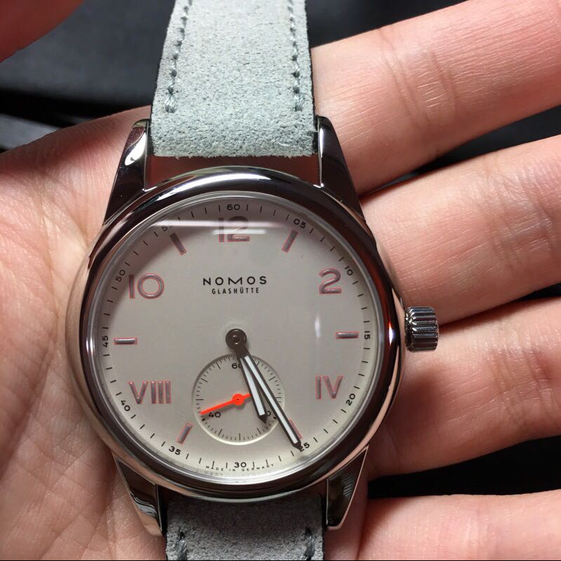 一直很喜欢nomos,选择了新出的compus系列,觉得性价比很高。在城堡家入的,36mm戴起来也不觉得小,肯定因为表耳比较长的缘故吧,多花了2000+就为了买一个背投,所以没有选择708。