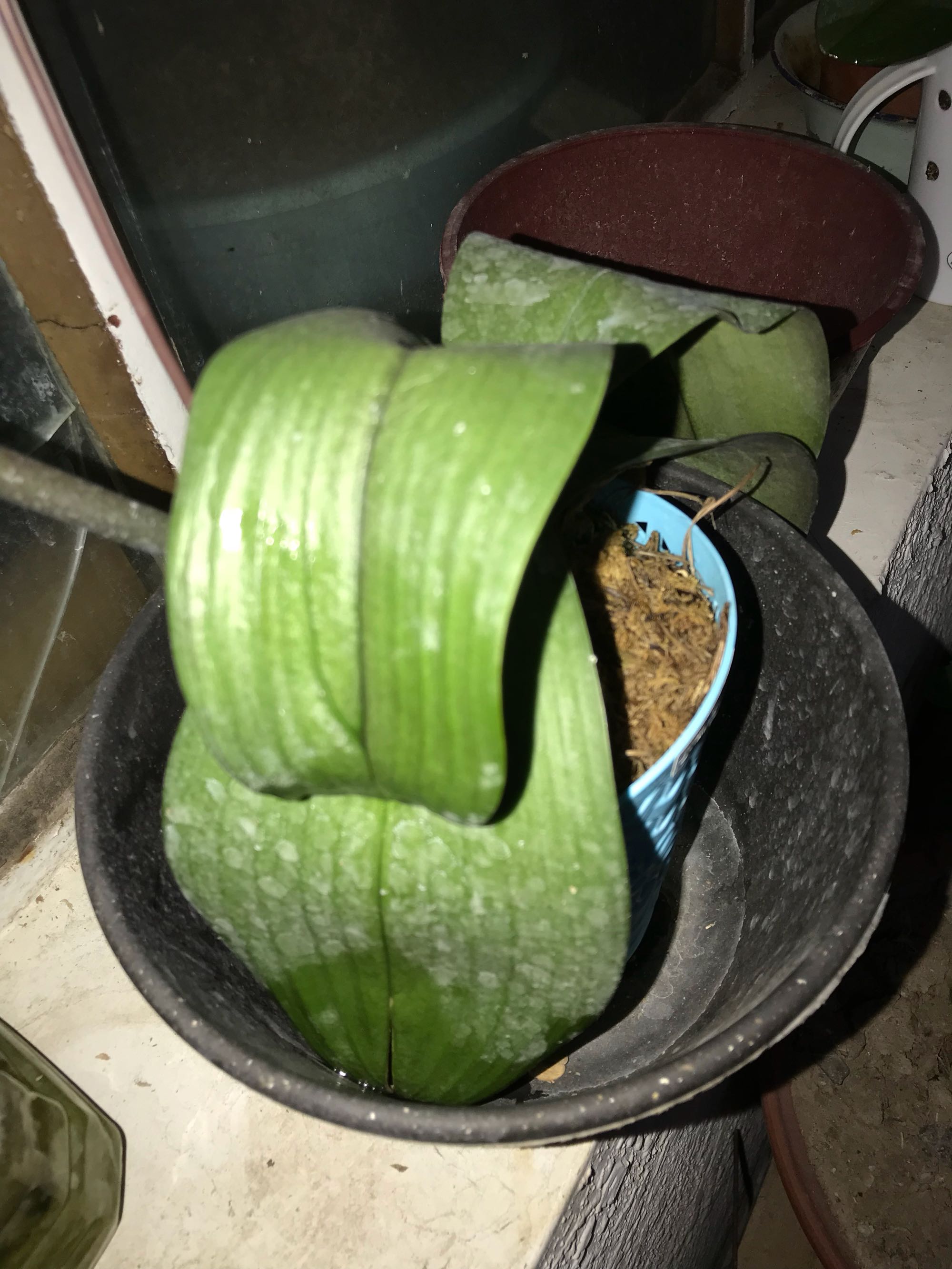 你这棵严重缺水,估计下部的根烂完了,建议挖出来检查一下,如果烂完了,全部剪掉,把上部的气生根埋进水苔里浇透水,保持上部一直湿润,很快就能缓过来,花剑开不开花都无所谓了,先保命吧