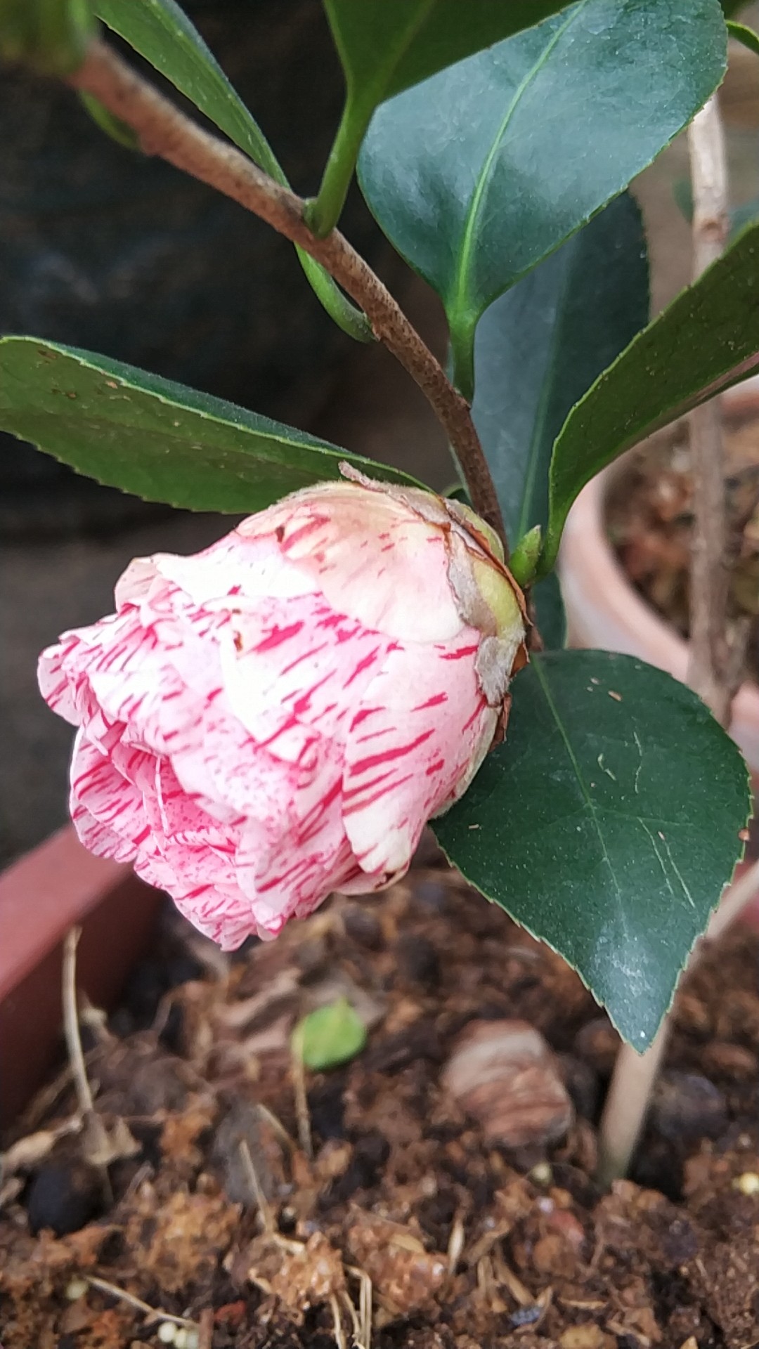 第一个是六角红,第二个是粉丹,现在要开的是粉底红喷丝和粉底红斑,最后一个苞是红斑粉白底。
