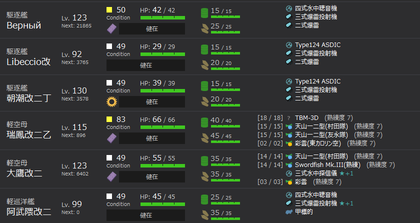 3最后一位放aww或者由良,要能开幕雷的cl,配装炸鱼套+甲标打两条cvl没扫清的水面舰(我有4条aww,这里随便用了