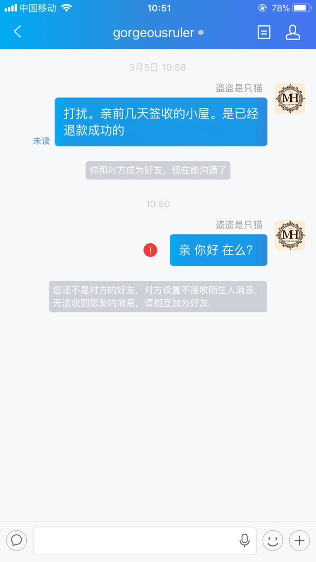 不得已爆下对方的ww账号希望有认识的小伙伴帮忙找下人。一个小屋顶多也就300块钱。但是一个人的信誉真的很重要。实体店开到现在我接触了很多很友好的小伙伴,希望这件事是买家姑娘可能没有看见消息而造成的误会。