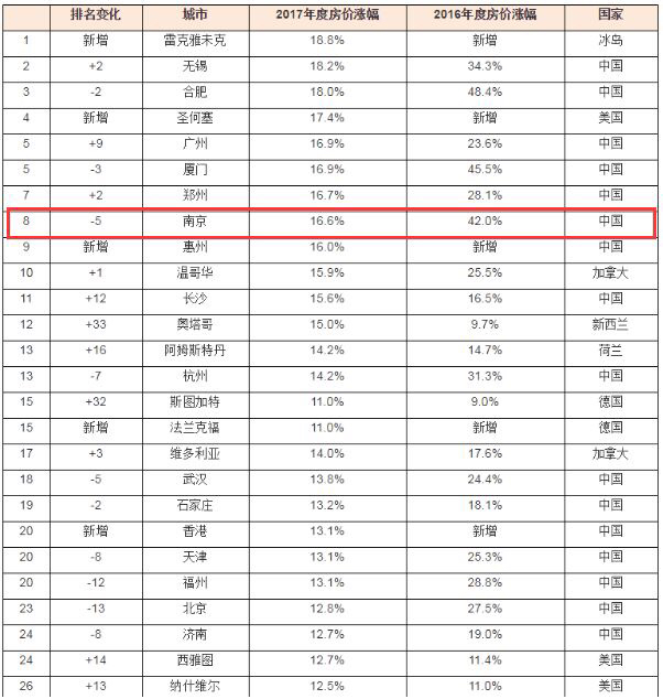 据胡润研究院发布的《2017年度胡润全球房价指数》显示,南京在全球房价涨幅排行中名列第8,涨幅16.6%,较之16年实际排名下降5位!