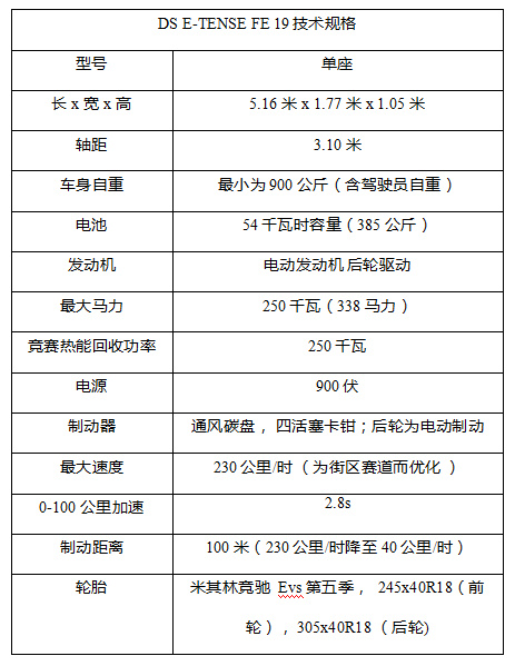 DS E-TENSE FE 19 所集成的大量新技术都源于DS Performance的构想。该车于2016年9月份开始创造,第一部分的创新成果已经提交,成功地达成了最小900公斤(包含驾驶员自重和380公斤蓄电池)车体重量的高难度目标,并于2017年春天进行台架测试。同时,DS Performance也致力于电控制动为基础的新型热能回收系统的开发工程。