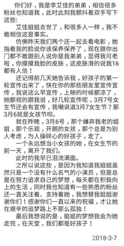 据李艾佳弟弟回忆,姐姐生前一门心思投入电影前期准备工作中,如今姐姐去世时间的前一天就发生在这一天,希望姐姐在天堂依旧幸福,做一个永远快乐的少女。