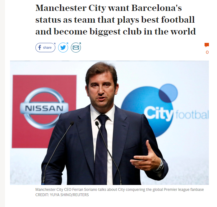 索里亚诺说:“曼城希望与巴萨将足球最具观赏性的一面展示给世界,同时成为这个世界上最大的俱乐部。”索里亚诺大概说了几点:巴萨是标杆,曼城未来俱乐部发展的楷模,但是曼城也不会被这种发展模式所禁锢,诸如皇马,巴萨,拜仁,曼联具有历史与传承。曼城的定义就是“未来”,全新的发展方式,城市足球集团的全球扩张,多元化推广足球产业发展,所以曼城吸纳传统俱乐部发展的经验,同时用全新的商业模式进行“全球化发展”。