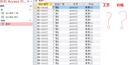 我的思路:有没有可能在查询增加一列自动编号,然后再建一个表,表上也建一个编号字段,并维护工艺、价格信息,然后通过字段再将查询和表关联起来。但是一个是我不懂操作,另一个是不知道查询的编号和其他字段件的关系是不是能够确保完全一一对应,避免工艺和价格对应错厂商和零件。