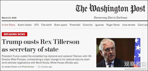 【观察者网综合报道】快讯!3月13日,美国总统特朗普在推特上宣布,解除国务卿蒂勒森的职务。