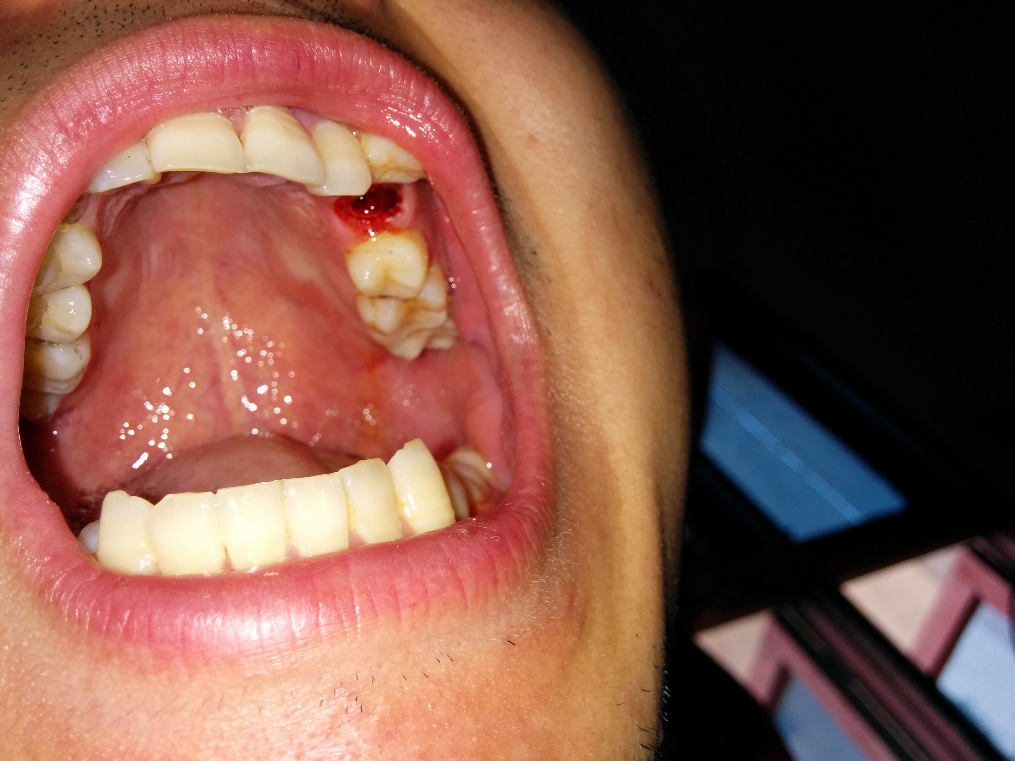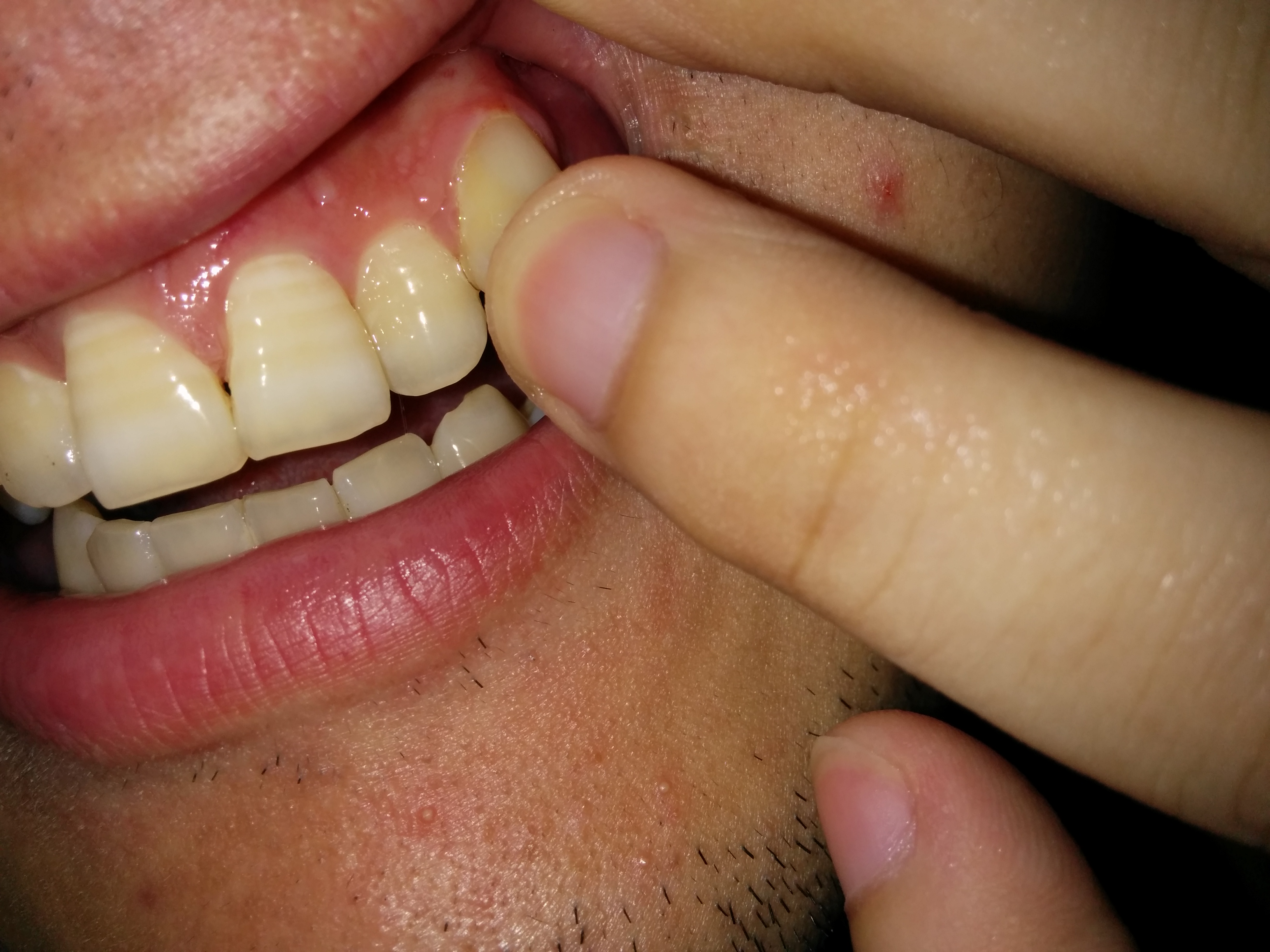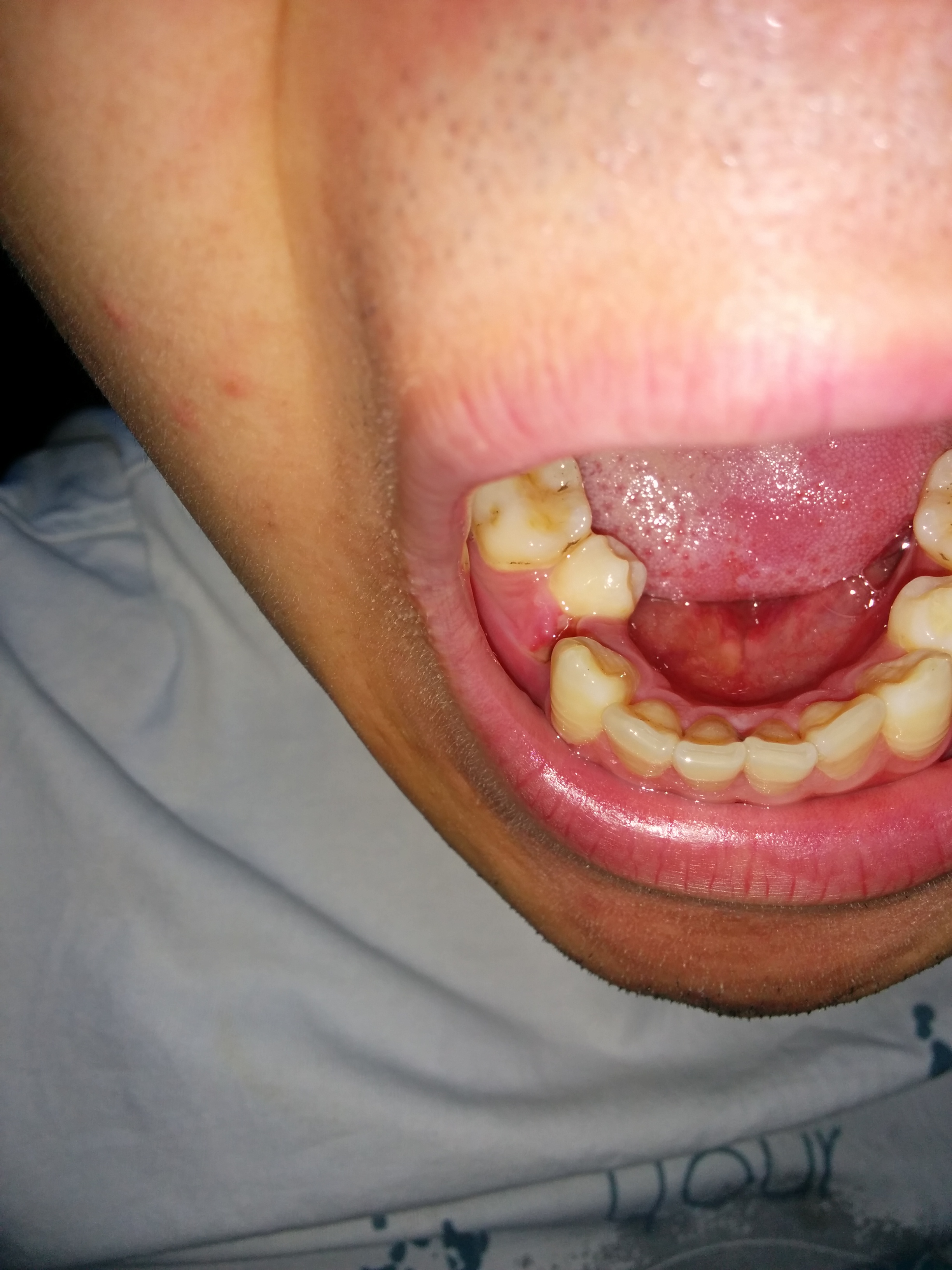 下牙舌倾的牙齿矫正成牙髓炎了,下牙一颗倒下去的牙齿看到了吗 就是那颗,医生本来要把那颗拔了,他承诺他把旁边的好牙拔掉,这颗牙拉起来没问题,现在弄成这样了真的想杀了他。