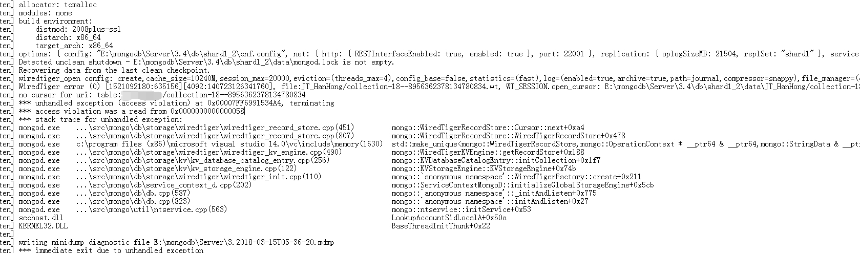 前几天公司的两台MongoDB分片服务磁盘要满了,然后要进行清理,搜了网上的repairDatabase方法,发现没啥用,只好导出数据,准备删除原本的库,删除后发现其他分片的磁盘还是满的,检查发现那几个分片上的库没有删除,就直接手动删除db中那个库的文件夹,再打开服务的时候发现服务打不开了,看日志是说找不到那个路径,大神们能帮忙看下吗?