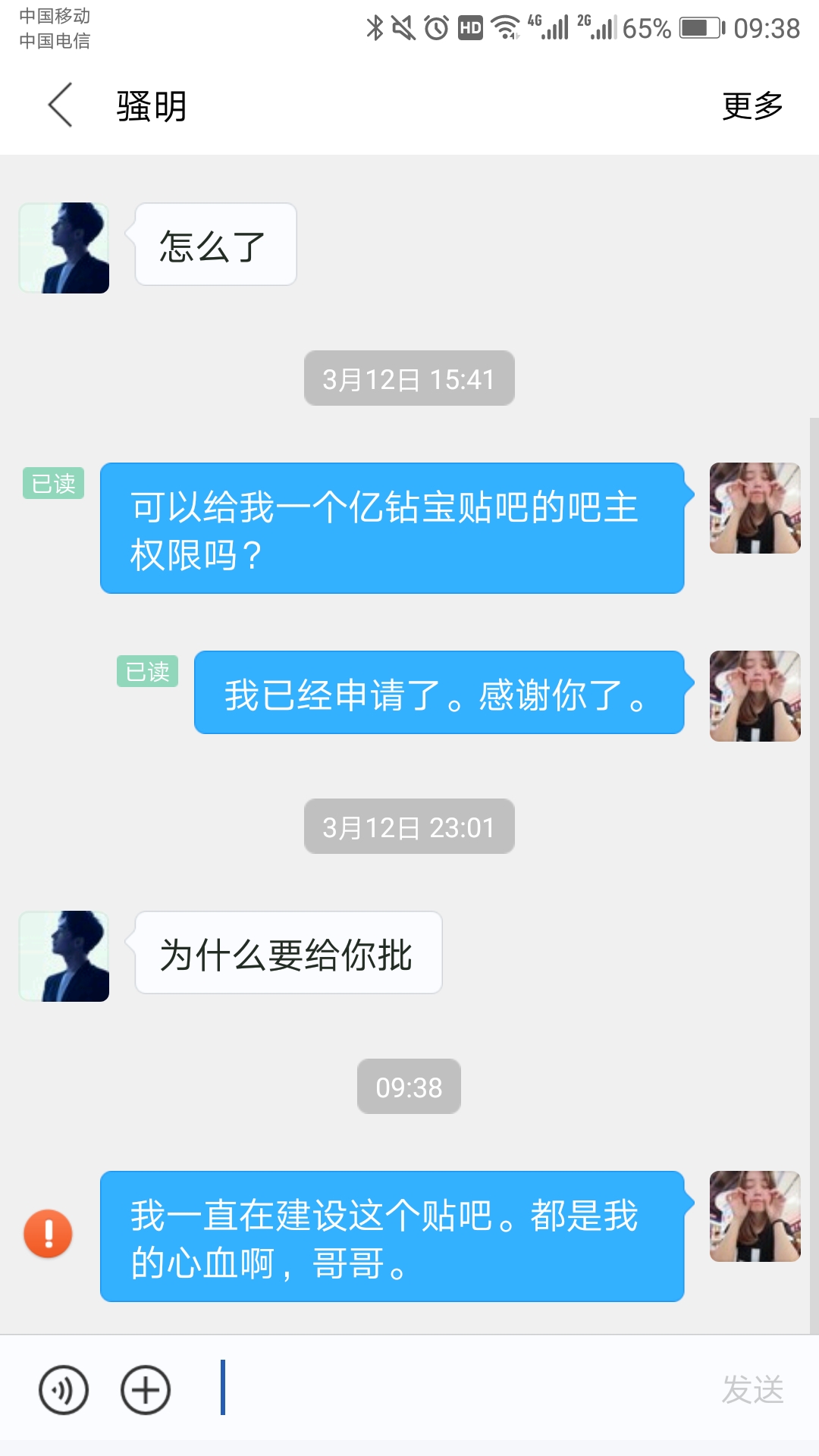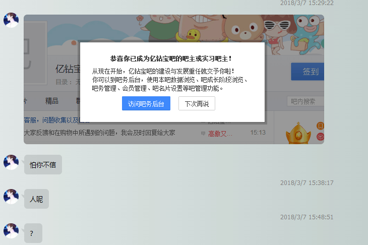 尊敬的贴吧管理人您好:三月六号我ID(微微扬起的唇笑)和图片中的人ID(骚明)同事申请亿钻宝吧的吧主职位,我一直在建设亿钻宝吧,发帖已经超过好几百条,但是最后吧主被ID(骚明)的人申请成功了,骚明在亿钻宝吧发帖只有十几条,并且他在成为吧主之后把我的心血,建设的帖子删除了,之后他联系上我,说把吧主职位卖给我,三千块钱,图片上有截图,骚明申请亿钻宝贴吧不是为了更好的建设贴吧,而是为了帮自己谋取私利。我请求尊敬的贴吧管理人把其吧主职位取消,下面有我的截图证据,请贴吧管理人务必明察,我在这里向您表示深深的谢意!