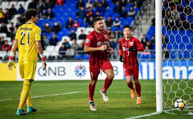 当地时间2018年3月13日,韩国蔚山,2018亚冠小组赛,蔚山现代0-1上海上港。埃尔克森庆祝进球(图片来自东方IC)