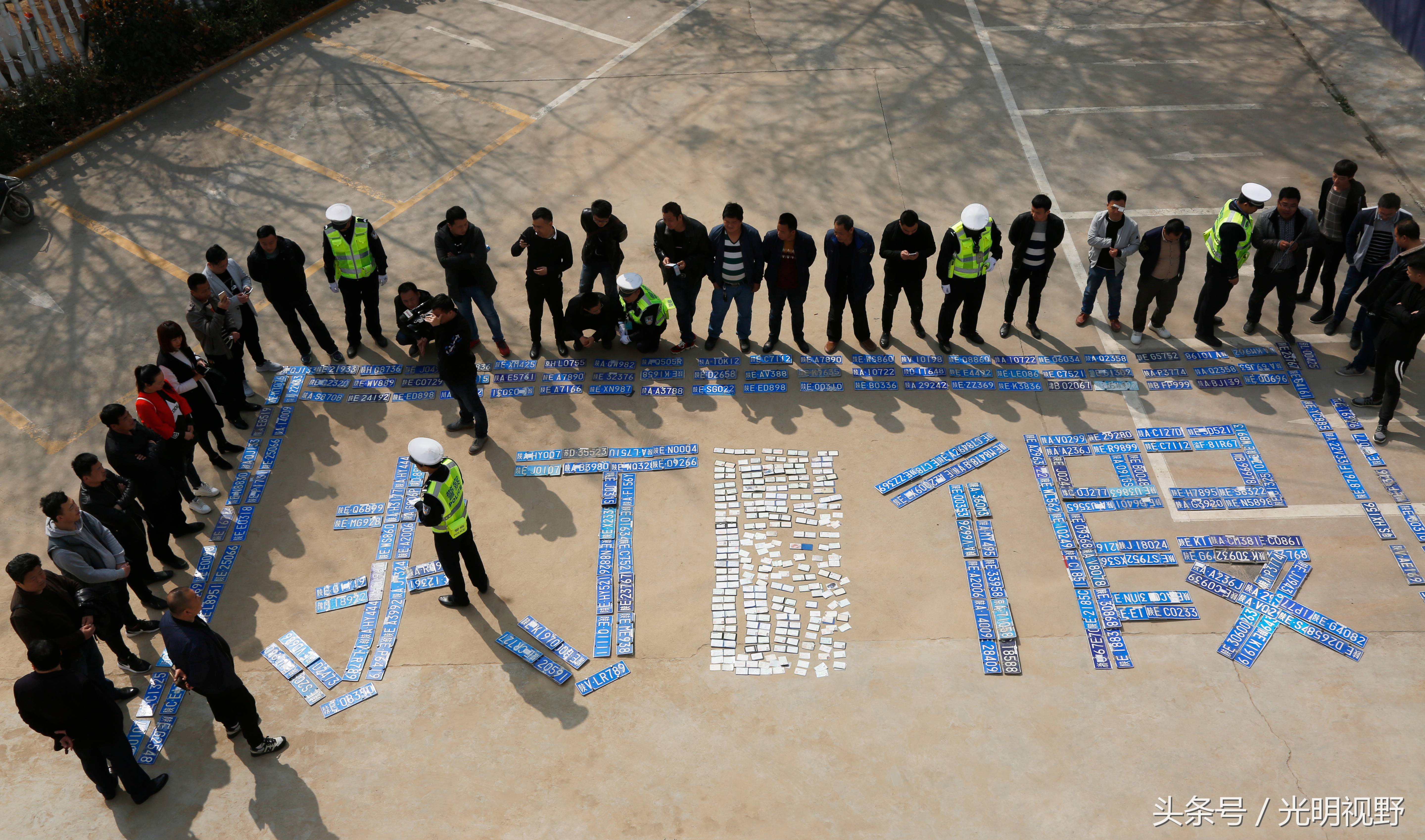 民警用假牌假证摆出“打假”字样,并组织记满分驾驶员学习假牌假证危害。(崔正博/摄 光明图片)
