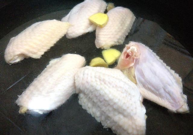 1、把鸡翅洗净后放到锅里,放入姜片,倒入没过鸡翅的清水,加热烧热到有浮沫出来,捞出来用清水冲洗干净沥干待用