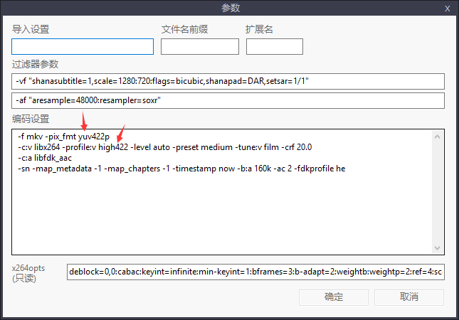 参数也可以自己改,当你需要一些GUI里面没有的ffmpeg支持的参数的时候,例如下面的关于yuv422的参数。请在所有其他设置完毕以后再来这里调参数,当你使用了GUI里没有的参数然后再次使用快速设置的时候会变回默认值。