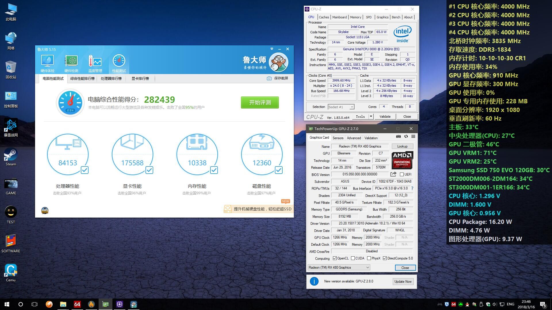 显卡分是默认成绩,超频能到19万~ 整体来说也就内存频率拖了点游戏后腿,其他都轻松应付一切