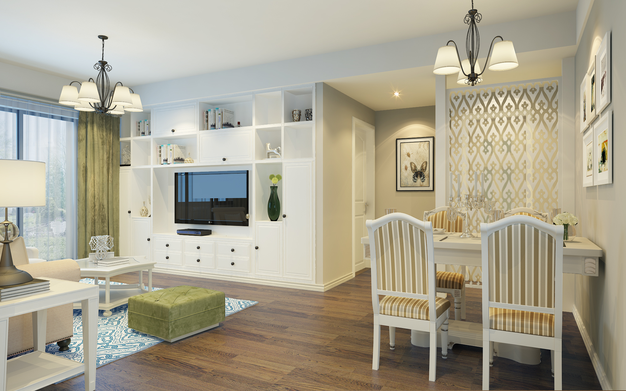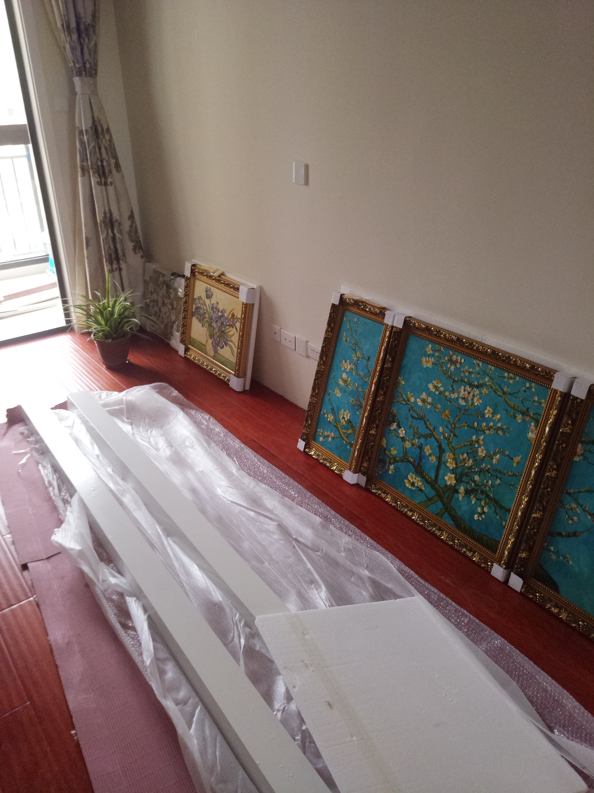 第一张是整体装修完之后家具都还没进场的照片,后面是陆续家具进场的照片,再来几张窗帘和装饰画的照片,还未挂上