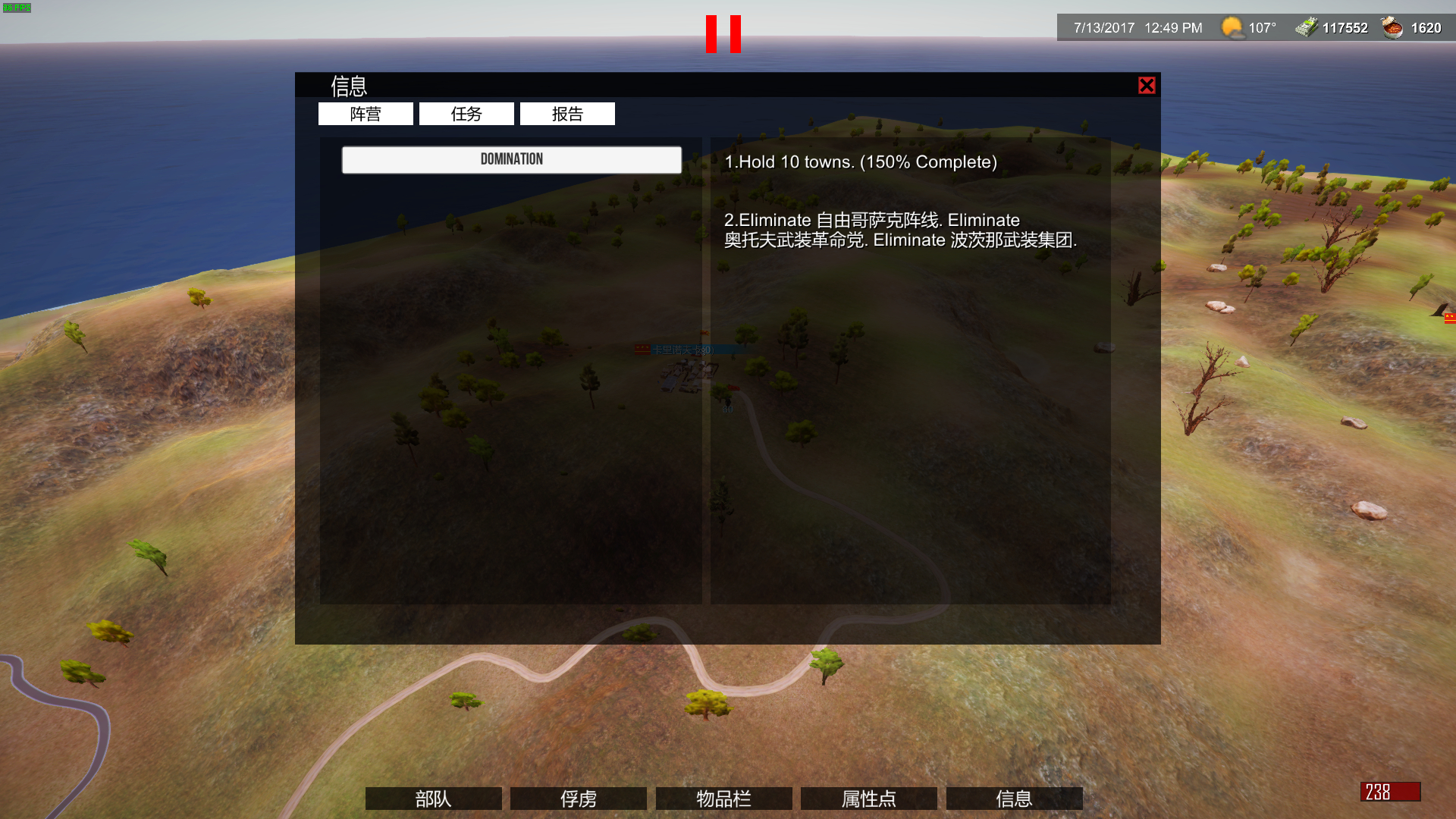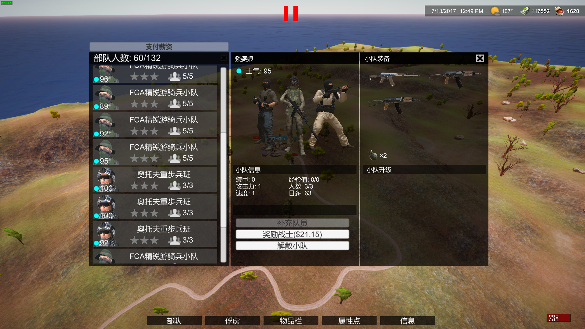 部队大概情况。城里不必留守军。我除了第一个攻下来的城里放了99个乌曼土匪之外其他城都是空的。也不建设,没必要。敌人攻城的概率小于等于0