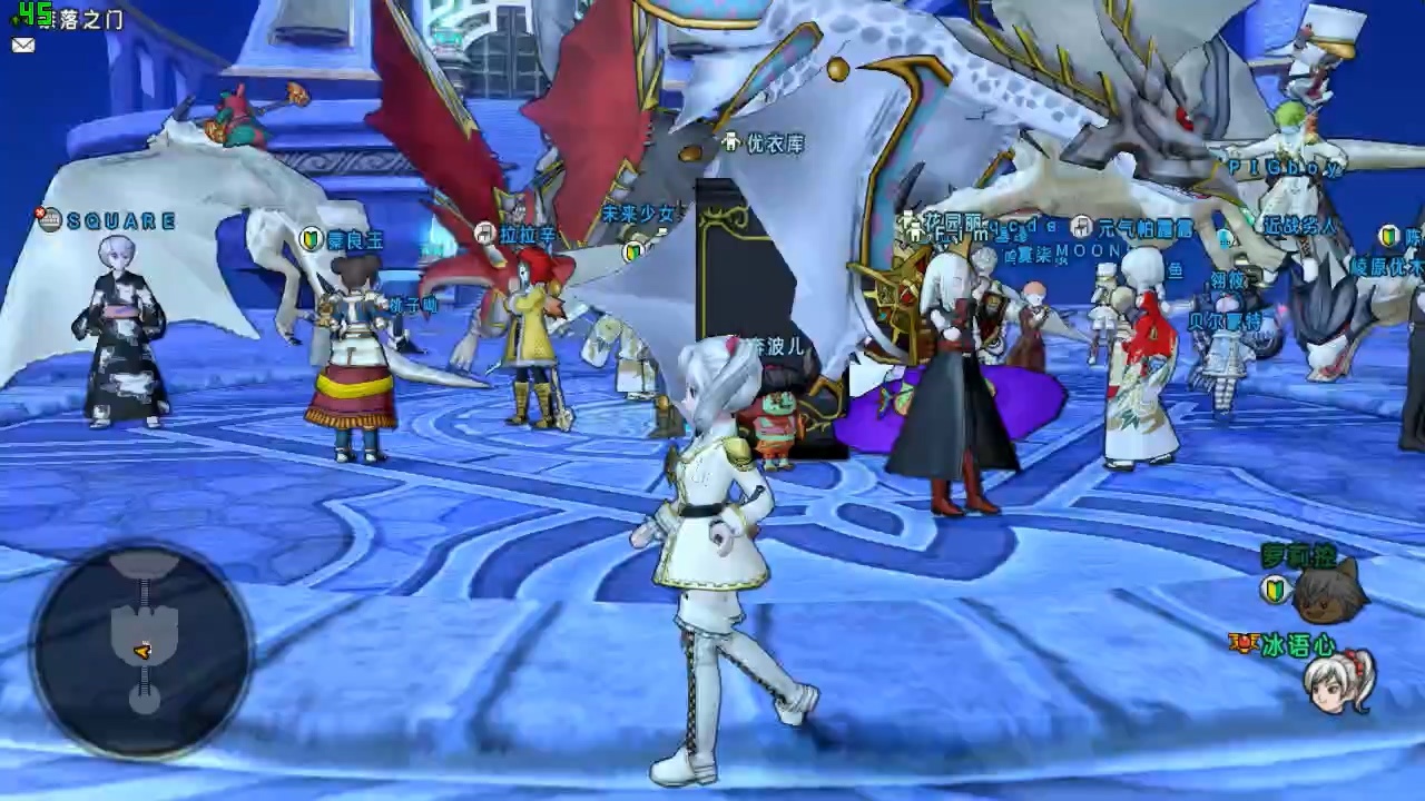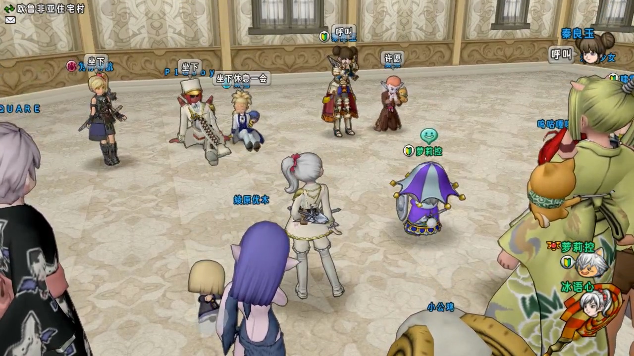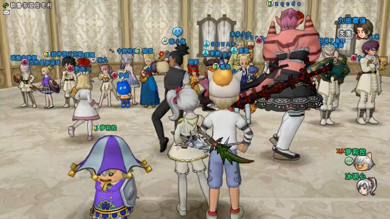 乱作一团的二楼现场当初想到这个游戏的时候还是很激动的,但对于这项游戏,一直存在两点顾虑。1.准备工序繁琐,DQX当中设置动作排序还是比较费事的。2.场面难以控制,大家一起参与游戏的话,因为站位等原因,很可能会乱作一团。