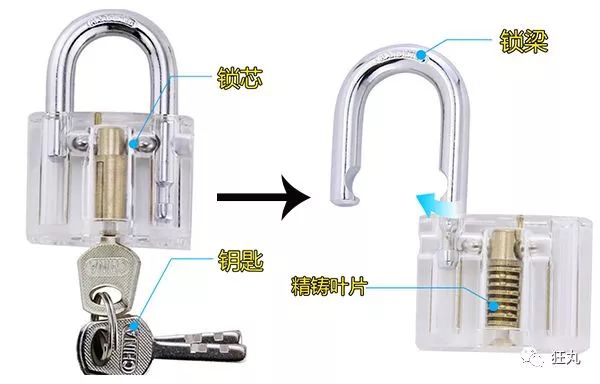 先来看看挂锁的主要组成部分,主要包括锁梁、锁身、锁舌和锁芯,
