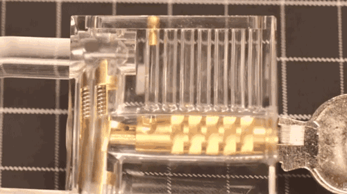 旋转锁芯开锁时,弹簧与「弹子」的机械运动一目了然。