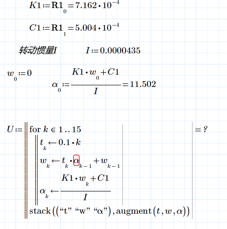 需要计算0到1.5s内,每0.1s的角速度和角加速度,简单的线性计算,但为什么系统一直说角加速度ai必须为矢量,所有的下标都是用a[k进行输入的,能否帮忙解决一下,谢谢。