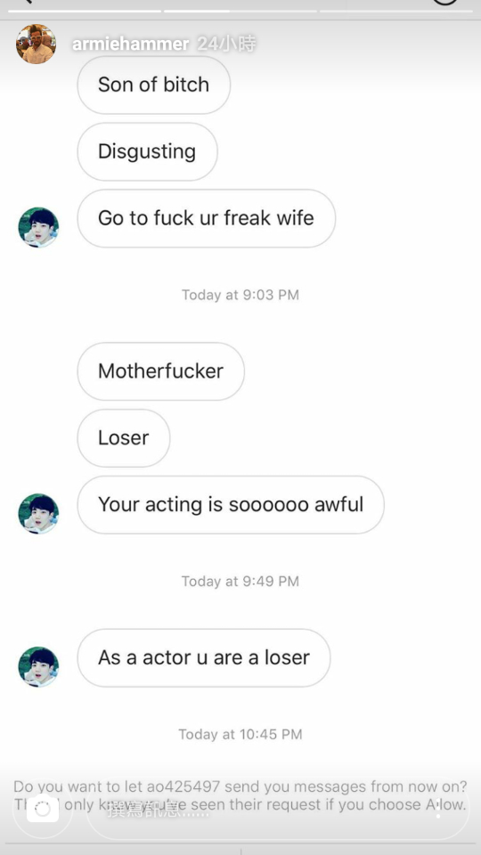 昨天Armie 发了一个小视频,里面有几张一个账号给他发的私信的截图。
