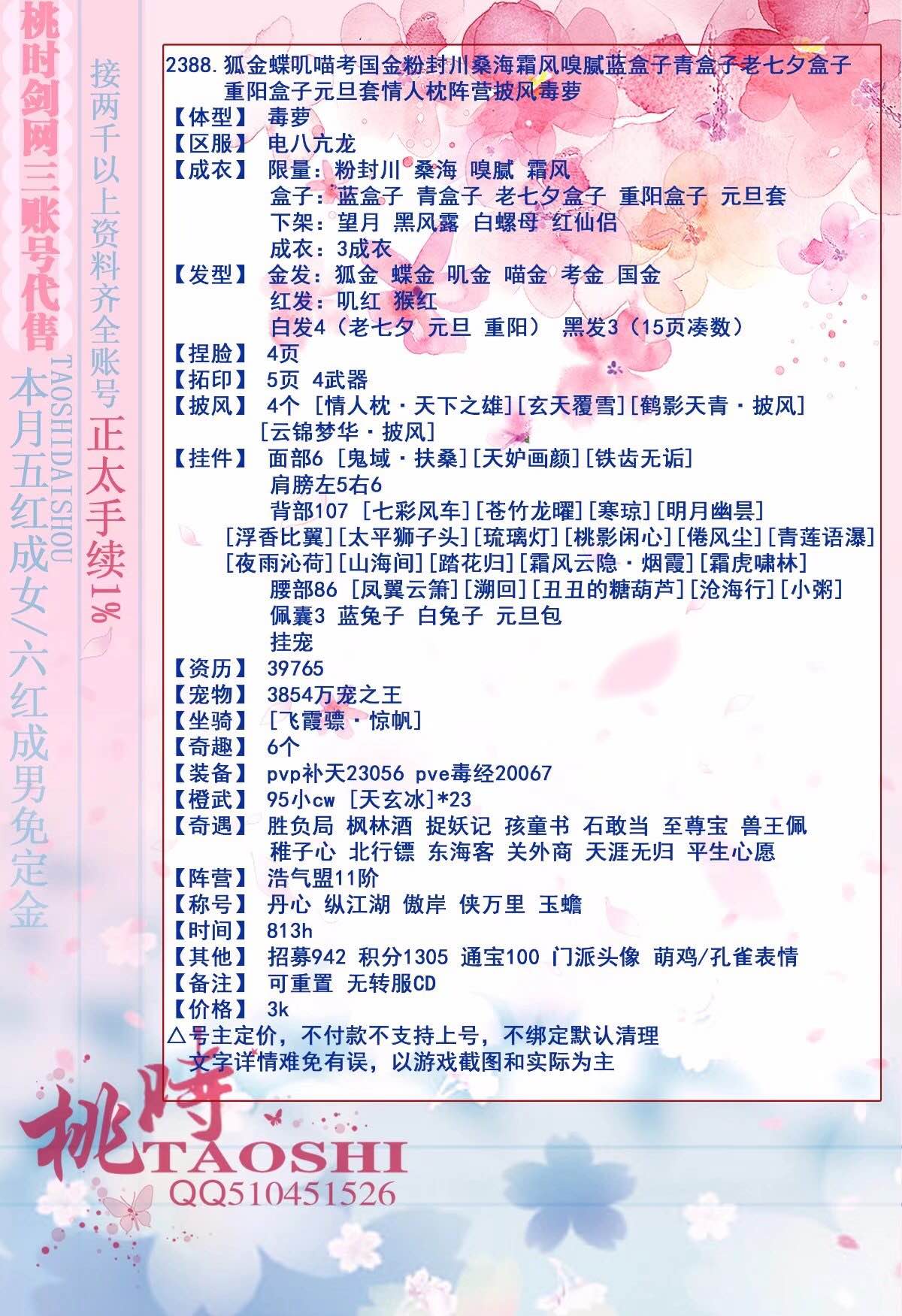 E170—【电点毒姐38888】资历6W8|阴阳两界|双橙武降玉灵知|五红狐金考鸡蝶金|粉白菜谷雨黑年轮蓝娃娃蓝兰庭水云重风/雪涛青盒蓝盒红盒情人枕白莲花六翼几度春|330+挂件周年特效齐多宠物多奇趣多奇遇多橙武黑白路三尺三山前置