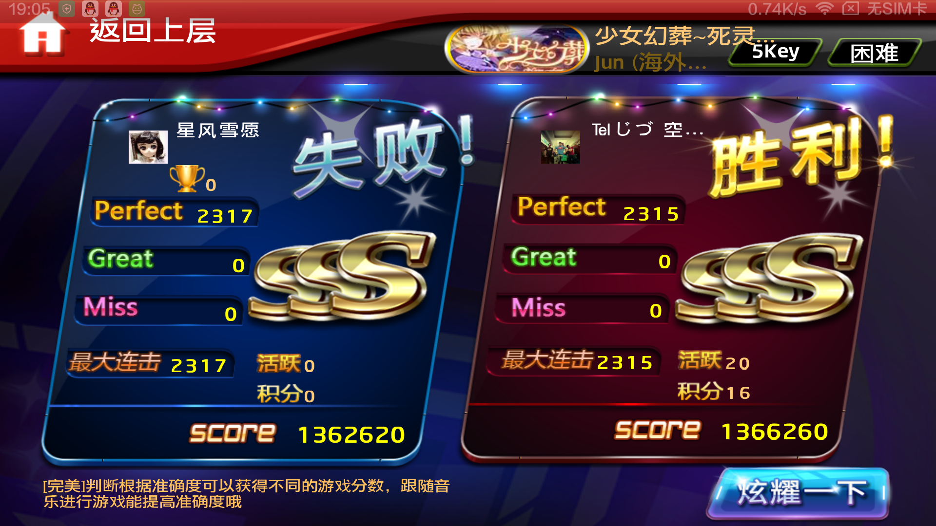 感觉这歌5k满分虽然不易但感觉也不太难,对面是电音女王.专业