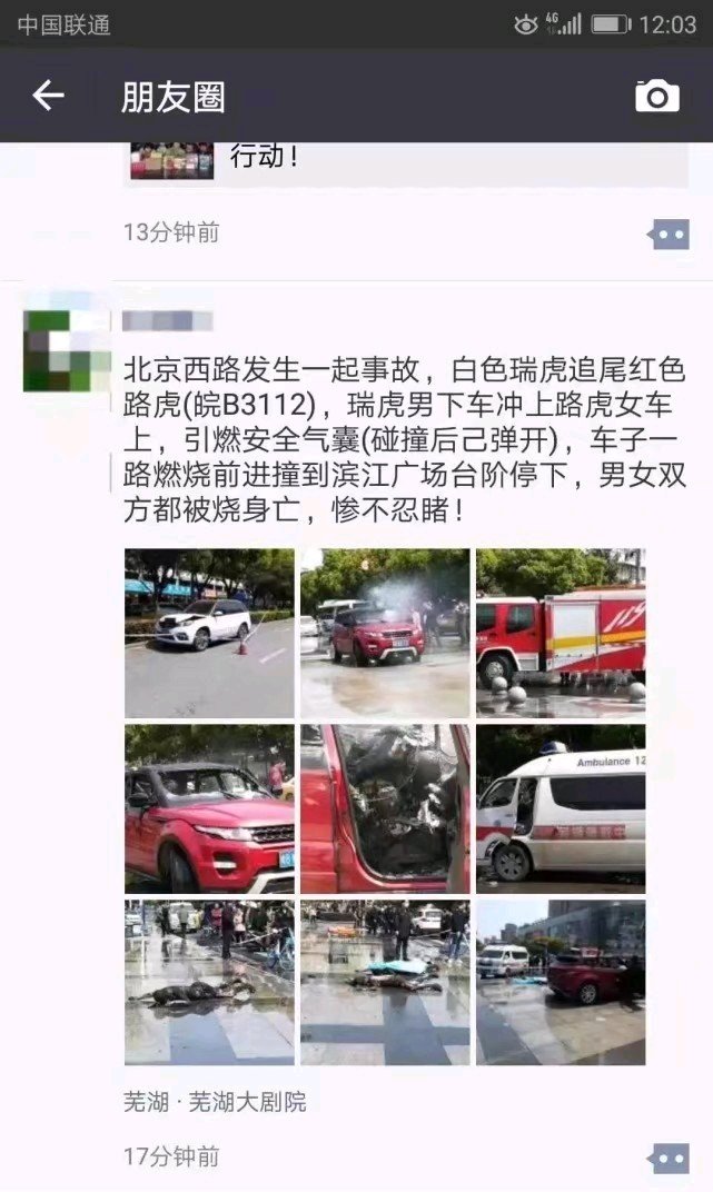 今日上午芜湖大剧院门口路段发生重大事故,一辆路虎汽车燃烧,车内两人均已身亡。