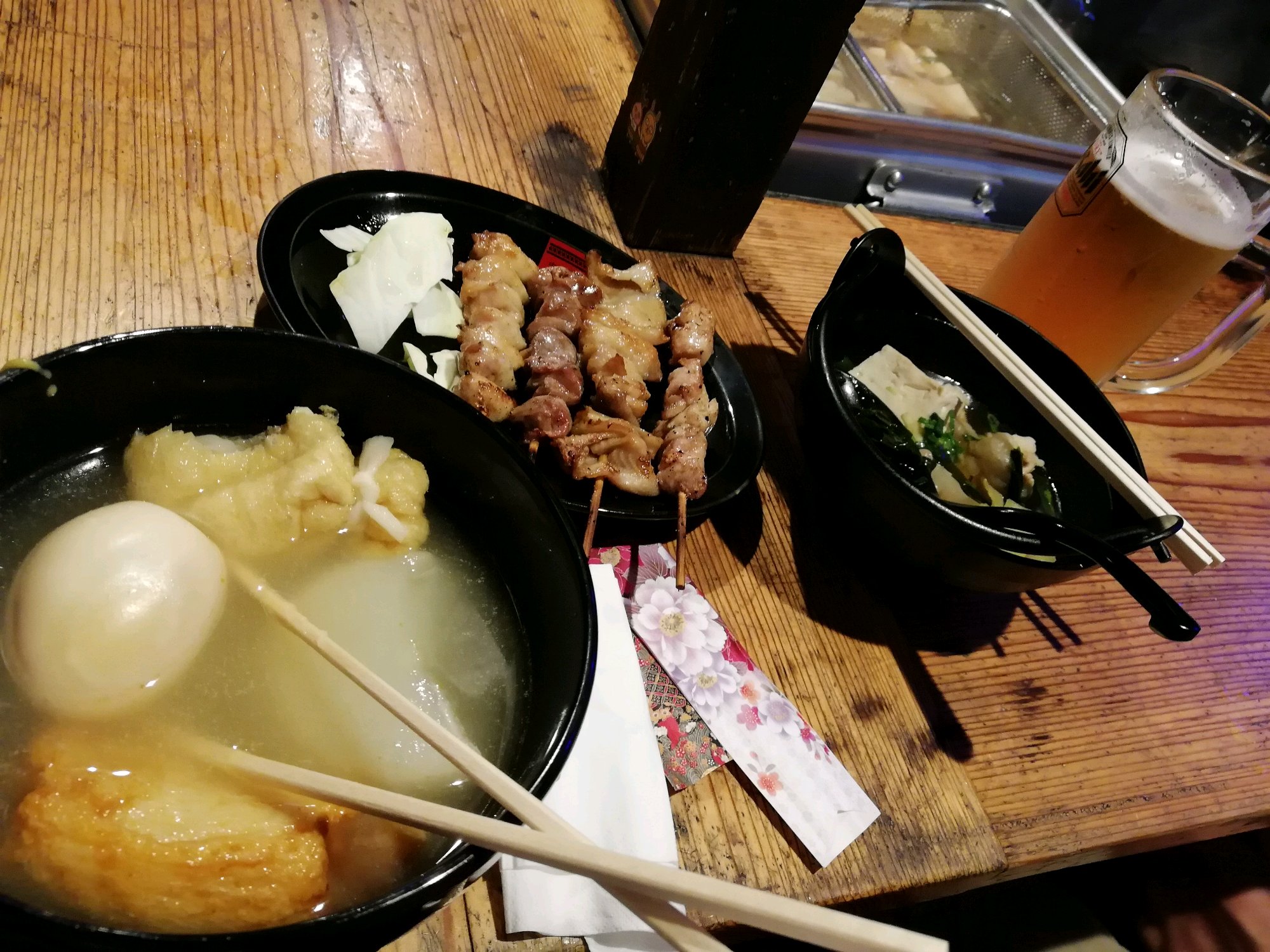 拉面,牛小肠锅,烤鸡肉/鸡胗/鸡皮,熬点(鸡蛋,油豆腐皮包年糕的福袋,白萝卜,炸鱼糕,鱼竹轮等)