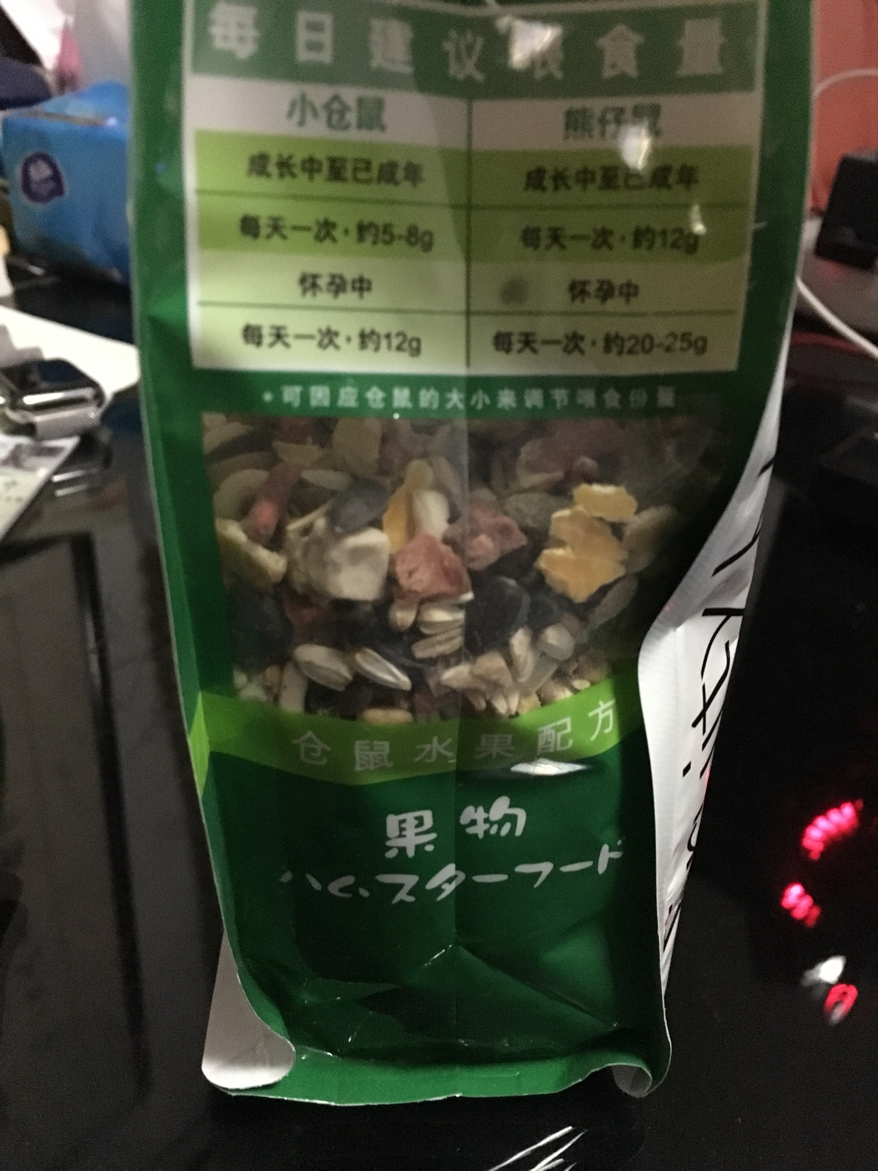 两只老公公是1月入手的,那时候不太懂,直接买了包常见的杂牌渣粮。后来通过大量阅读各种帖子,知道了品牌粮的存在。。。那包渣粮快吃完的时候,正好看到有人推荐滨田的水果粮,就下了一单。也是巧母鼠在这期间生了一窝,公鼠也早就分开了,在给母鼠补充各种营养的同时,拿公鼠做实验试试新的粮食。。。结果几乎不太碰那些水果块,只吃瓜子这种。。。后来给母鼠放了它也不怎么吃。。。好担心母鼠会因为饿了回收小鼠,我又买了袋VK的美毛。。。然后并没有用,它们几乎不太吃。。特别是里面那颗绿色的,几乎不碰。。。最后没办法了,去买了专门适合老公公***urgess。打开包装我震惊了,如图,为什么里面有那么多的玉米片,还那么大。。。不过好消息是ss吃的很欢。。。而且现在小