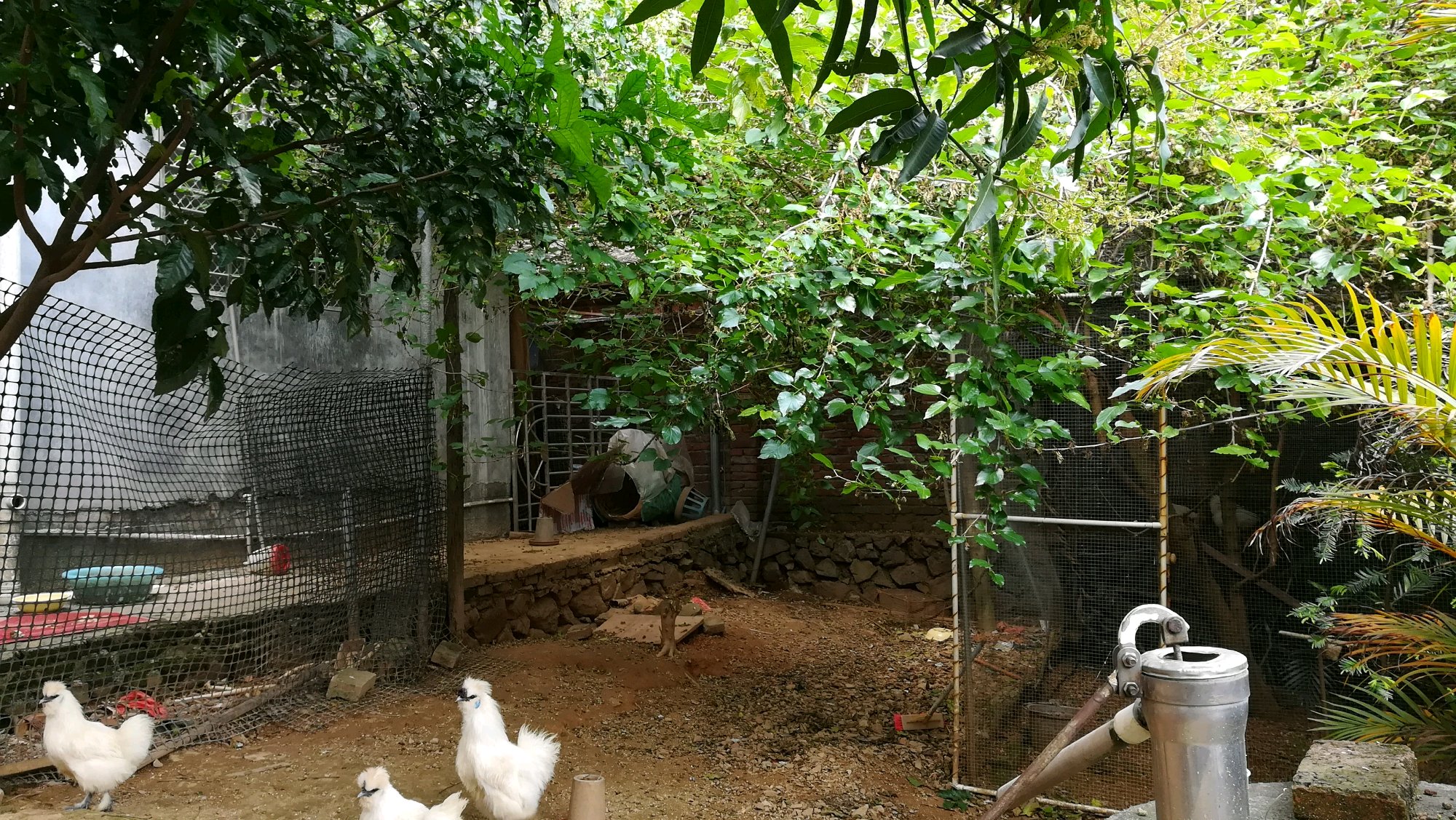 饲养环境是屋后用铁网围一成的笼子。笼子里种了一棵桑树。叶子是桑树的叶子。