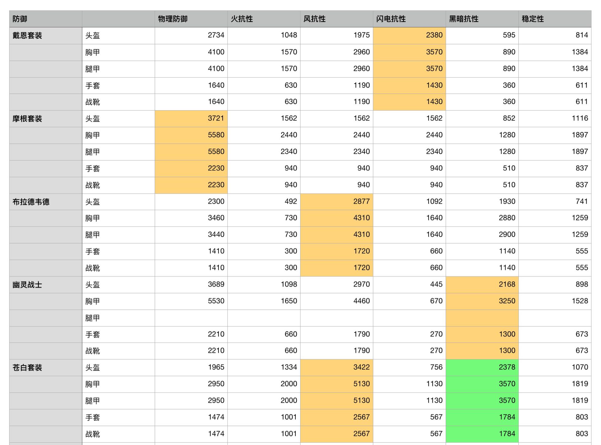 幽灵套装的主要抗性属性是暗属性,但是依然没有苍白套装高。均为s+套装升级到max之后的数值。