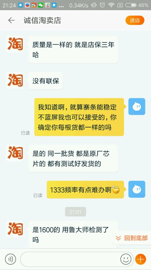 各位老哥,你们说要不要退,退了就亏了邮费(广州到深圳)。其实下单之前我在实体店问过的,其中一间熟店新210,二手150其他店还要贵一点,不过没有去讲价之类的,但是都不是三星的。当时某宝看到有三星的,抱着试试看的态度。用memtest200%覆盖无错误,94左右内存占用挂页游挂了十几个钟也稳定,看时钟也还可以。
