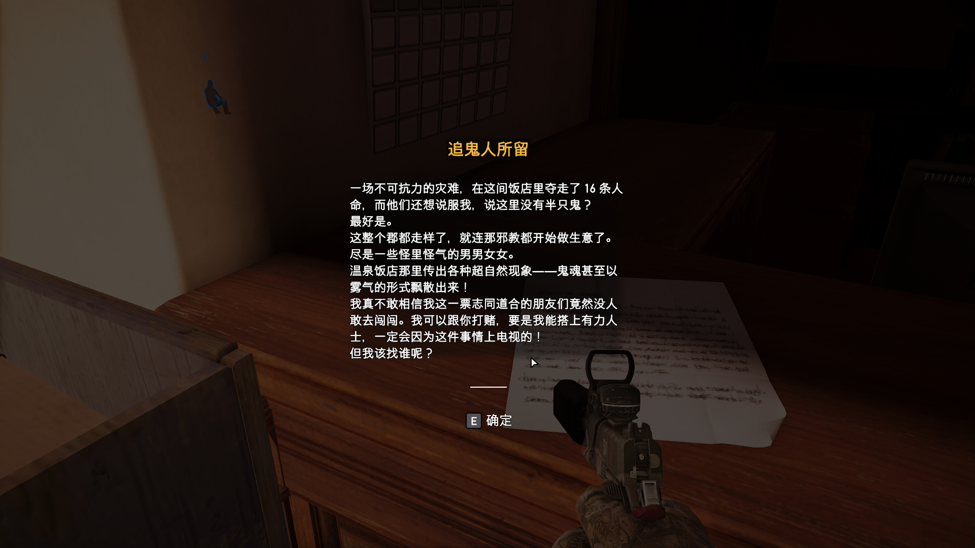 我今天也玩到这了 找了一年鬼 就二楼有点怪声 三楼保险箱房间捡的饭店钥匙也不知道干嘛的 赶紧来个大神找找鬼在哪