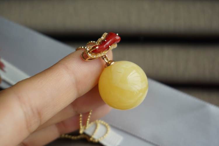 蜜蜡圆珠吊坠 满蜡鸡油黄 18k金镶嵌钻石 天然阿卡枝珊瑚点缀