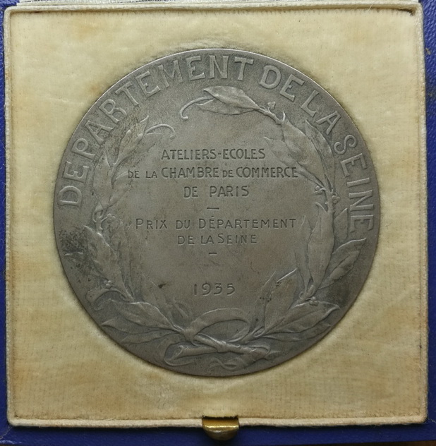 50mm 62g 丰饶角厂标,配原盒。正面书巴黎市,女神像右下角为巴黎市纹章。章体右侧为雕刻家Georges Henri Prud'homme (1873-1947)签名。下方有巴黎城市座右铭,拉丁文箴言:"FLVCTVAT NEC MERGITVR"“漂泊而不沉沒”。背面书塞纳省(法国历史上的一个行政省,1790年设立,最初称巴黎省,1795年改称塞纳省。1968年撤销,拆分为巴黎省,上塞纳省,塞纳-圣但尼省及瓦勒德马恩省。)