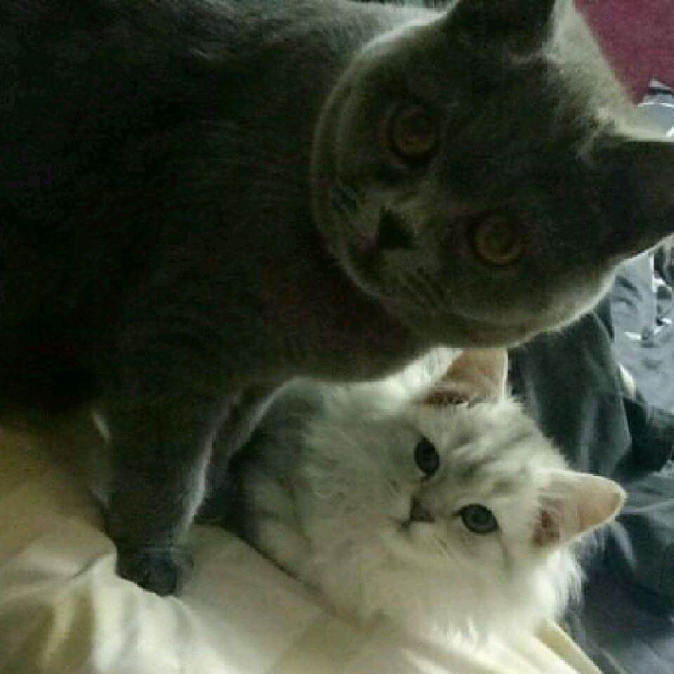 我家小猫刚来也这样,成天跟着大猫,还趁大猫睡着了吃人家奶,大猫醒过来眼睛瞪得像灯泡!大猫当时才六个多月。我家大猫经常趁小猫睡着了去闻它,过几天就玩儿熟了。