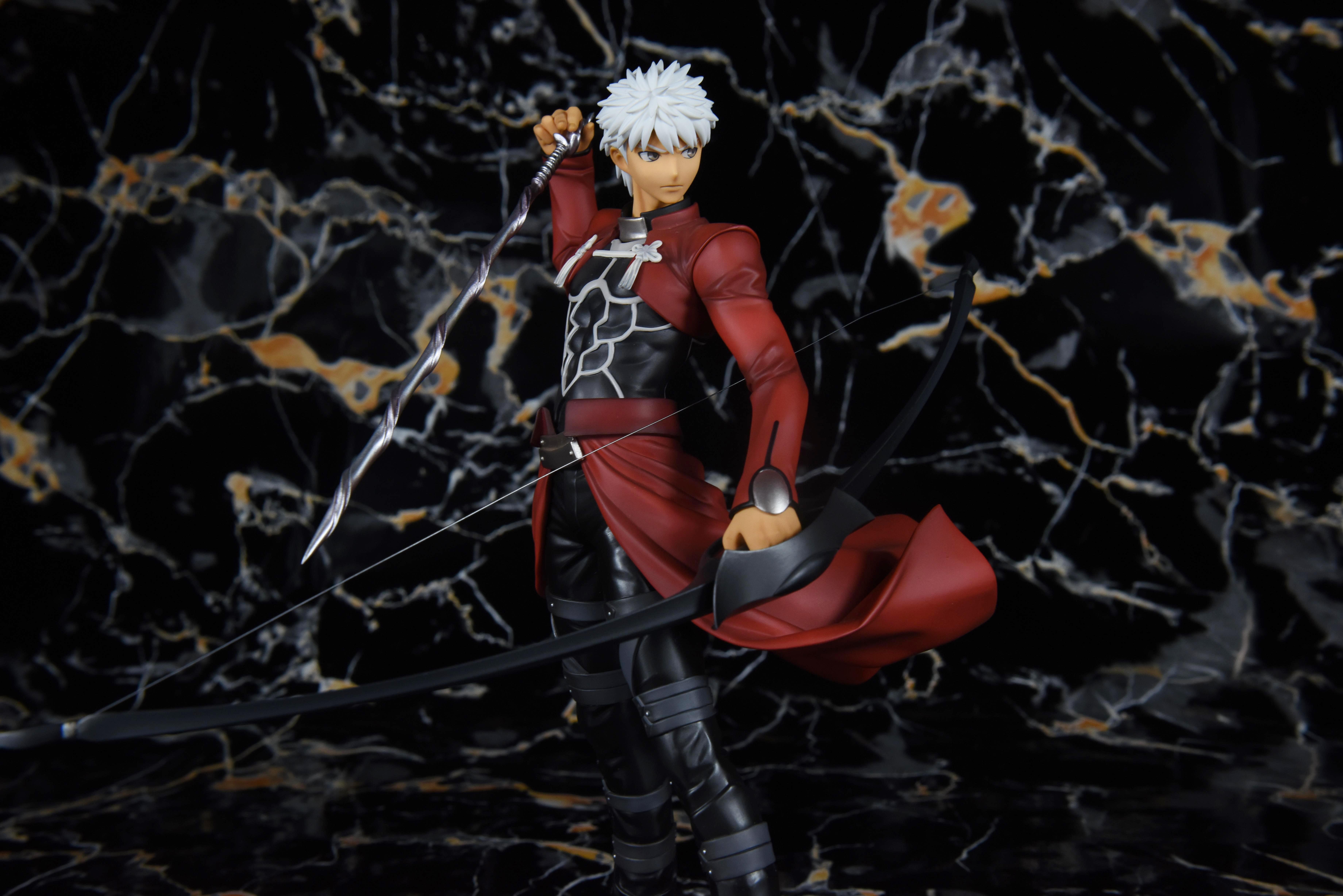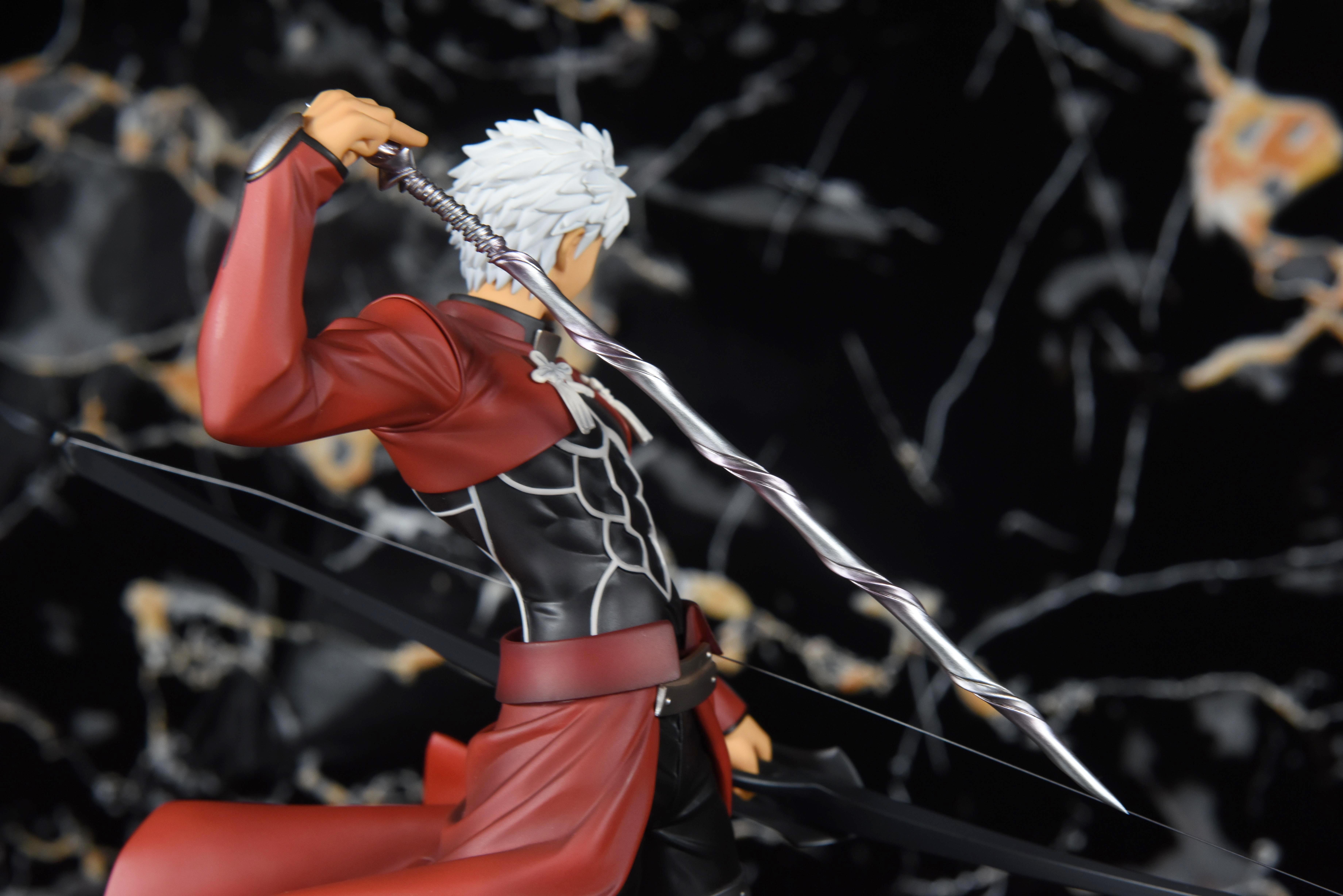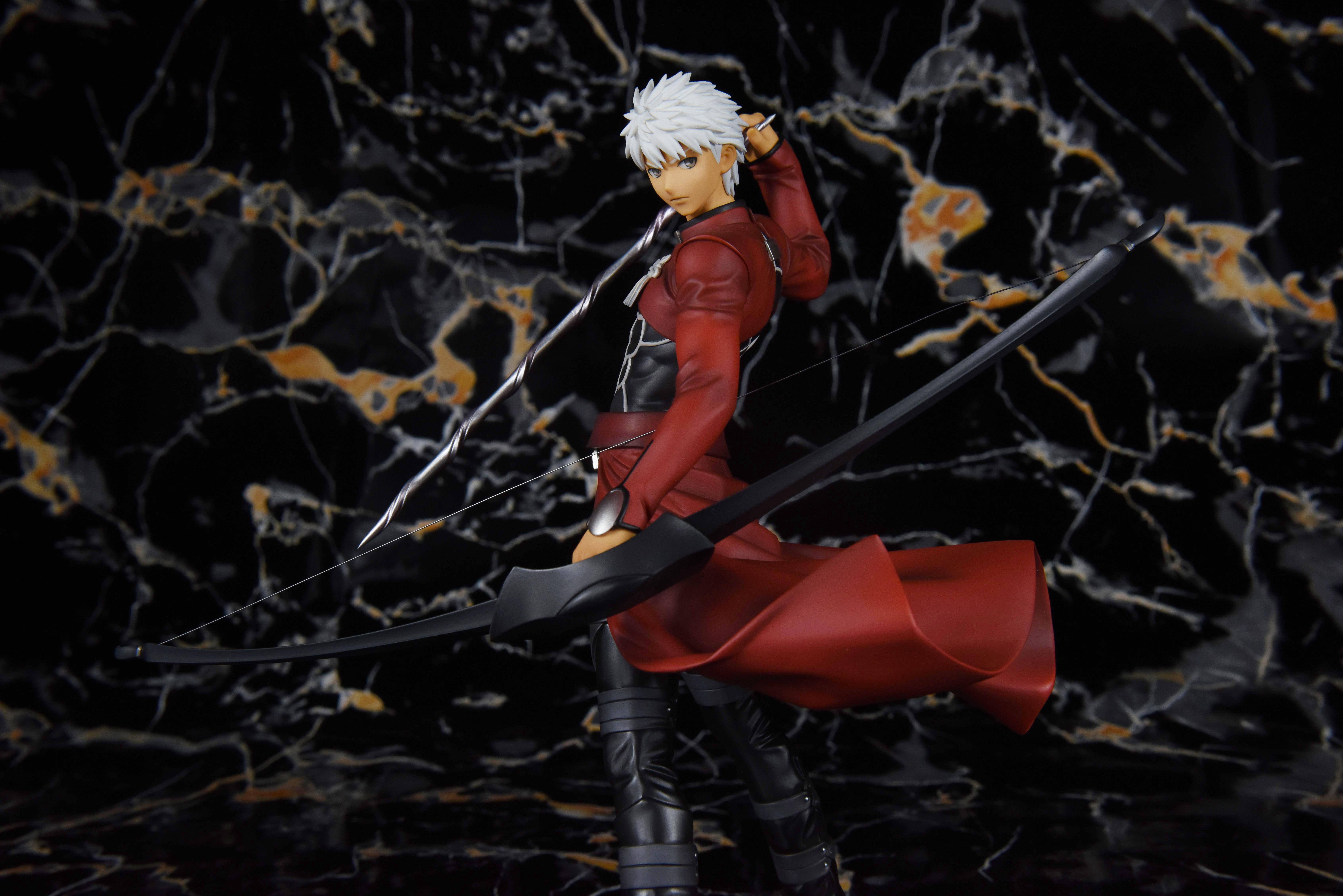 来欣赏一下散发红a的英俊形象。他一手握弓,一手持伪螺旋剑,侧身而立,鲜红的圣骸布随风卷动,一头白发在风的吹拂下也轻轻扬动着。他偏过头,双眉微皱,神色严峻,投向远方的眼神冷冽而锐利;褐色的皮肤是他饱经风霜的证明,同时又颇有种成熟男性的性感味道。手办整体以黑红白三色调为主,搭配运用在弓箭和鞋部富有质感的银漆,干净利落;造型动静结合,细腻地刻画出红a在战斗前夕持弓遥望的帅气形象。
