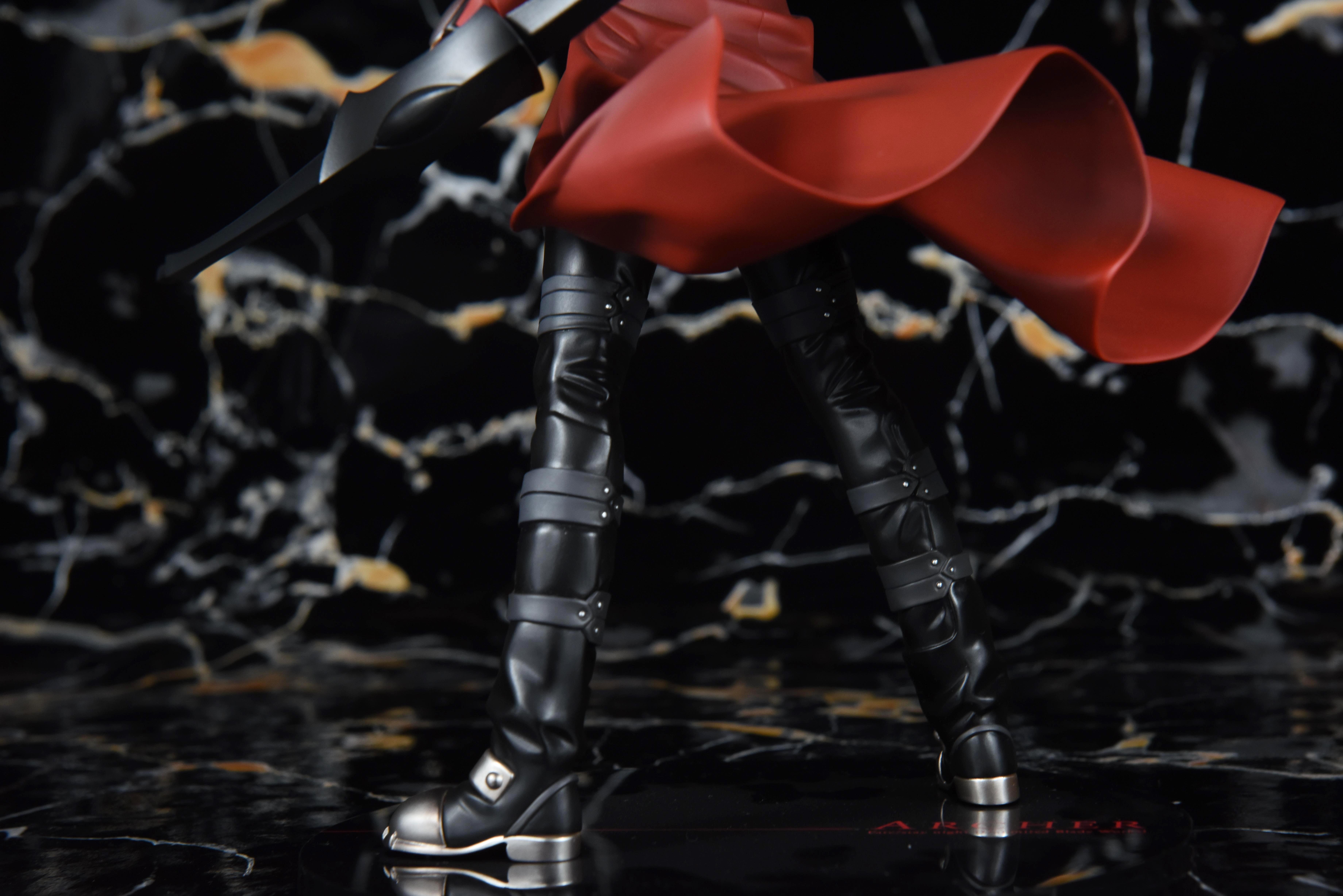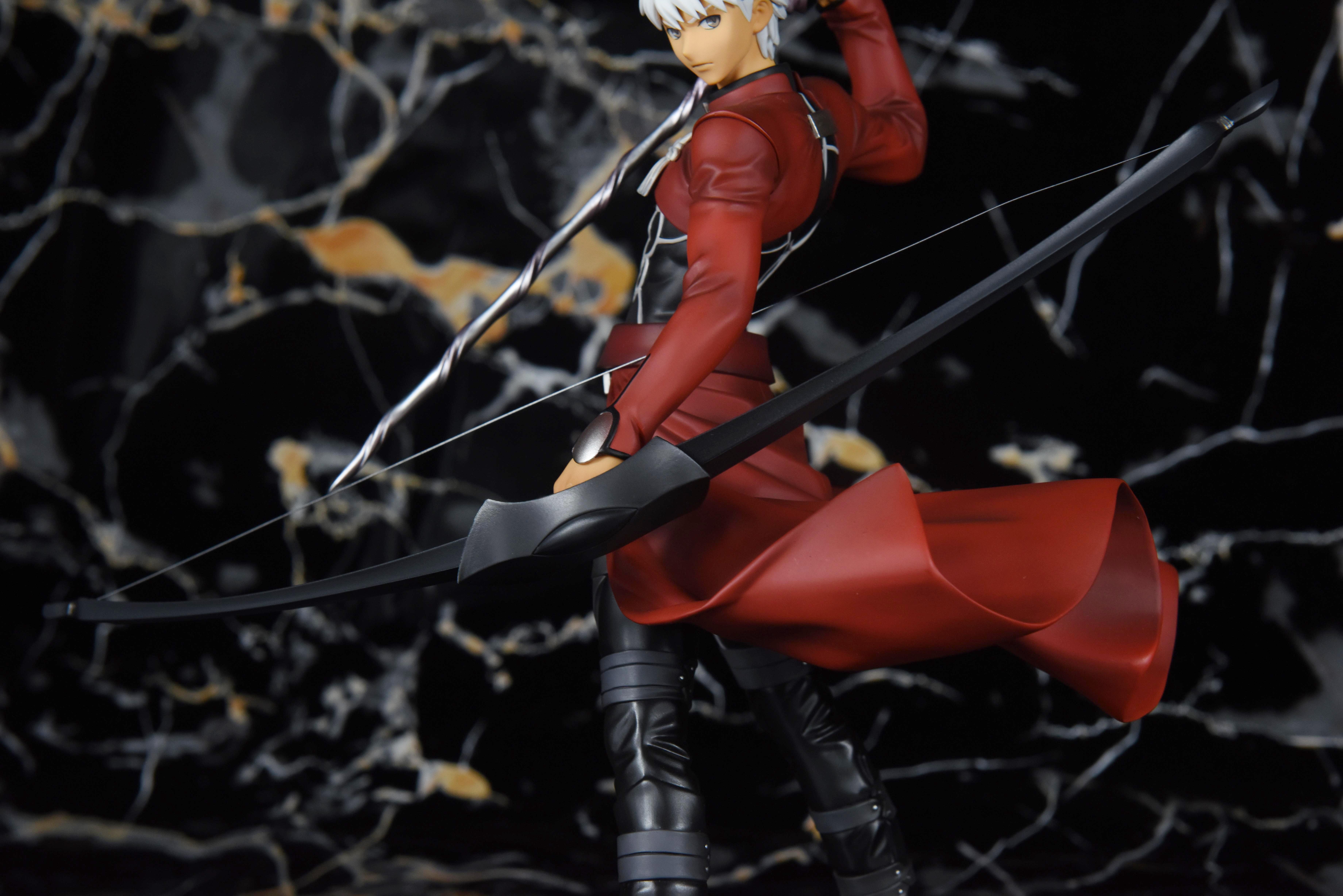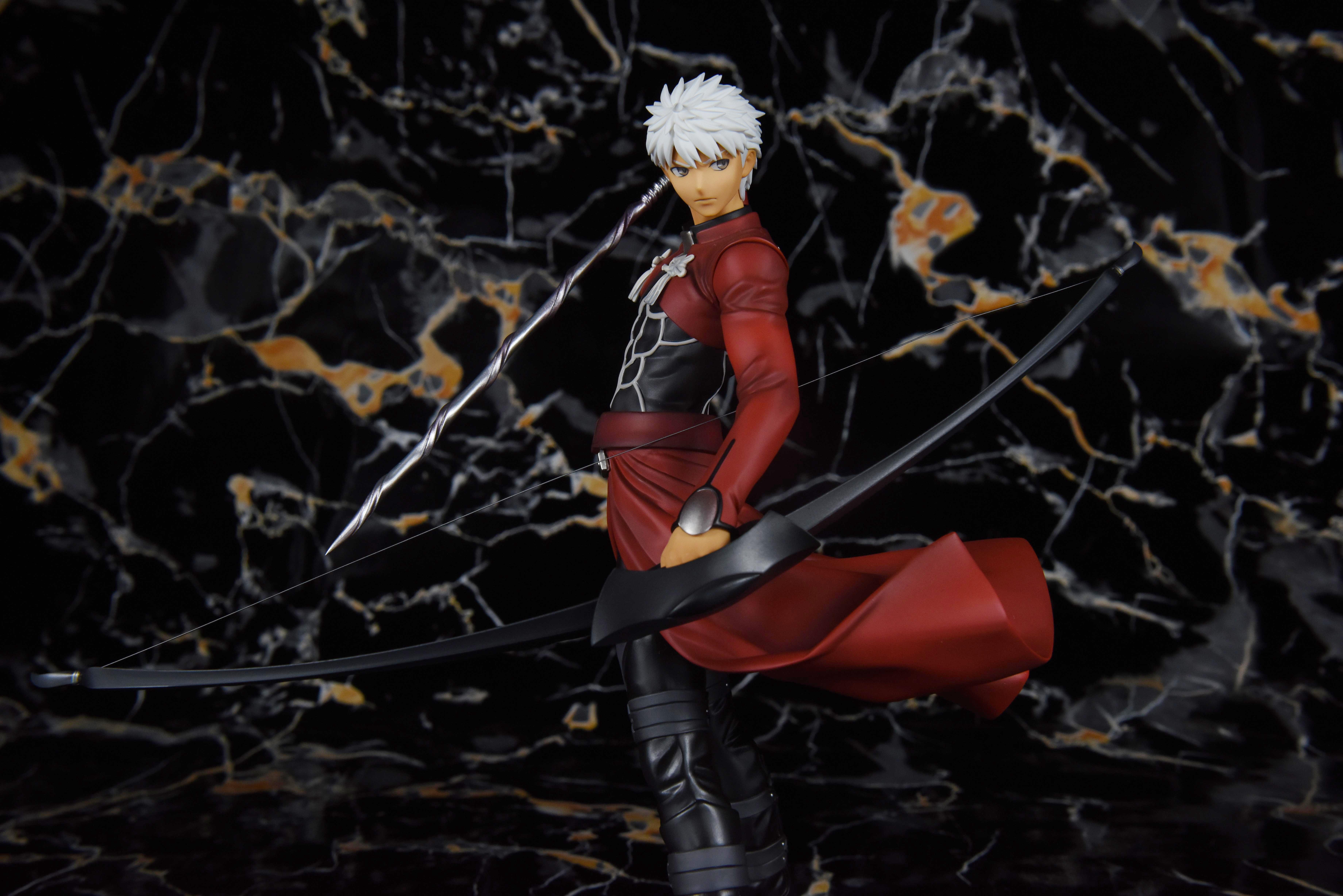 来欣赏一下散发红a的英俊形象。他一手握弓,一手持伪螺旋剑,侧身而立,鲜红的圣骸布随风卷动,一头白发在风的吹拂下也轻轻扬动着。他偏过头,双眉微皱,神色严峻,投向远方的眼神冷冽而锐利;褐色的皮肤是他饱经风霜的证明,同时又颇有种成熟男性的性感味道。手办整体以黑红白三色调为主,搭配运用在弓箭和鞋部富有质感的银漆,干净利落;造型动静结合,细腻地刻画出红a在战斗前夕持弓遥望的帅气形象。