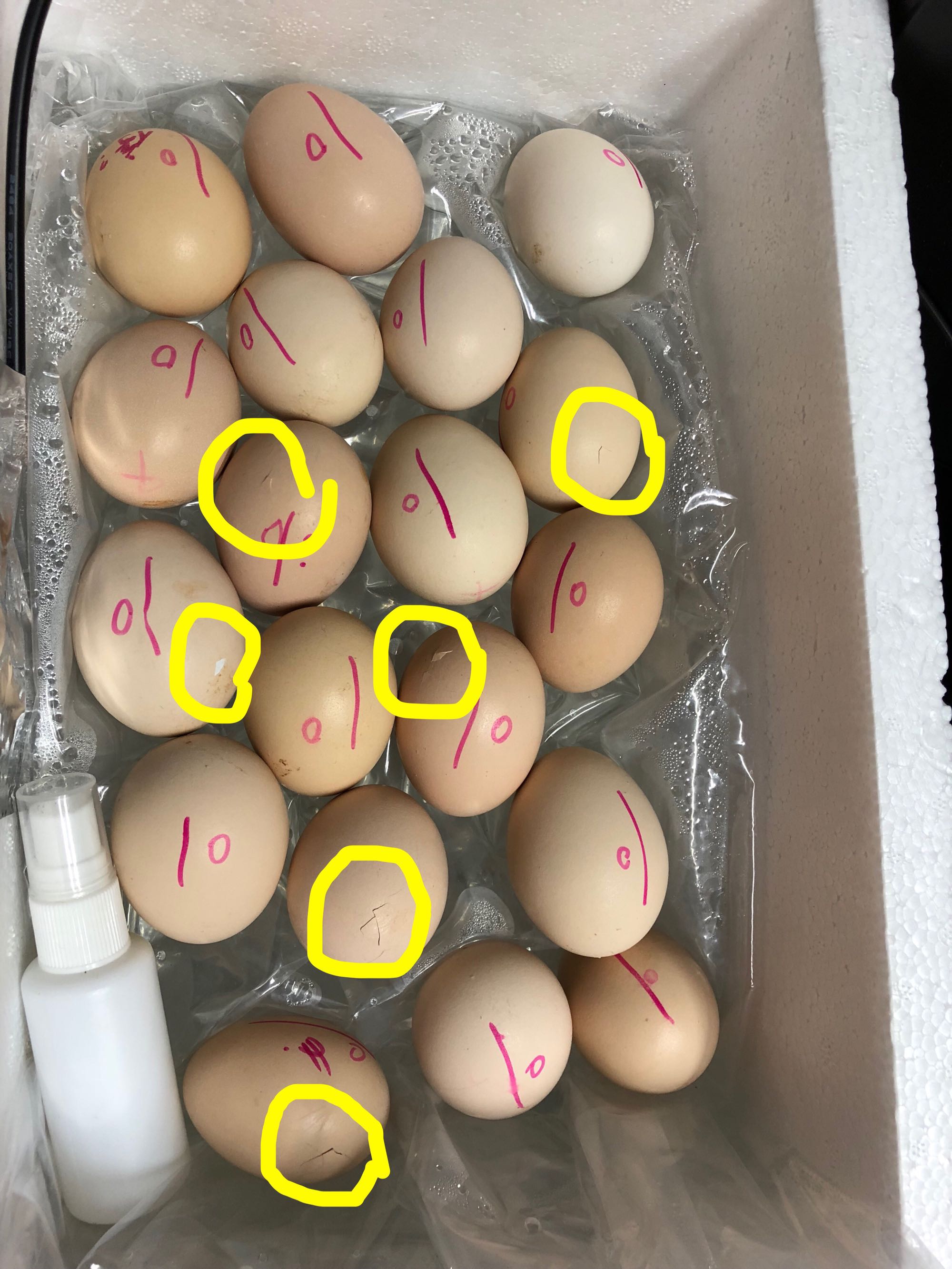 照了下有两个气泡蛋,其他的也气室比较大,没太大信心,卖家让我都放进去先,我做了标记~